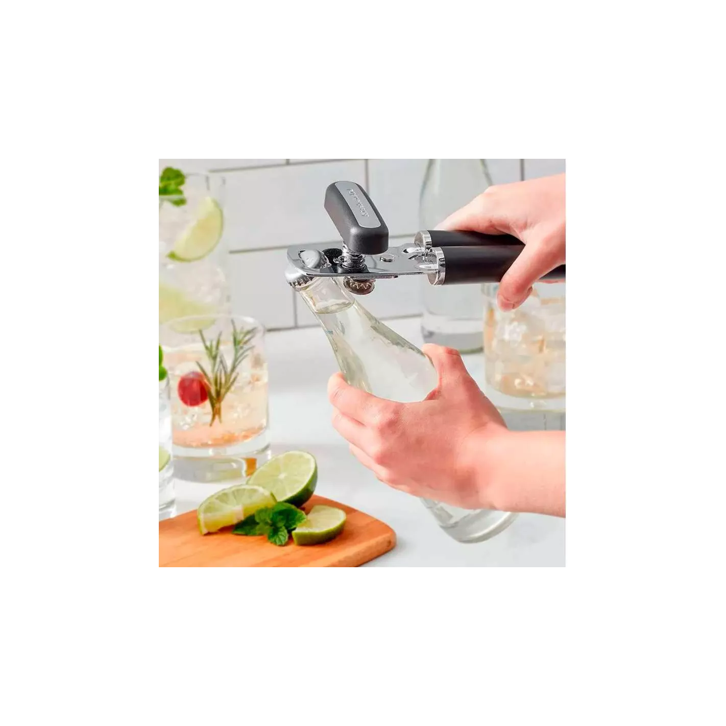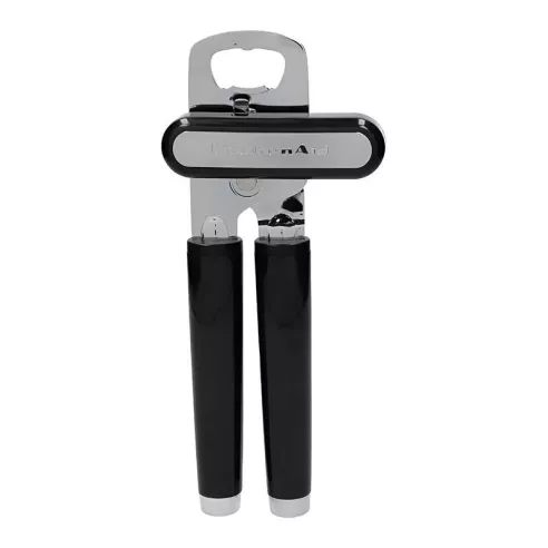 El abrelatas tiene una perilla grande y fácil de girar que hace que abrir latas sea una tarea sencilla. También cuenta con una rueda de corte afilada de acero inoxidable de primera calidad y un abridor de botellas integrado en el cabezal. Este abrelatas es duradero y cuenta con asas ergonómicas para brindar un agarre seguro. Las asas tienen un acabado brillante, refuerzos cromados satinados y una insignia cromada satinada.