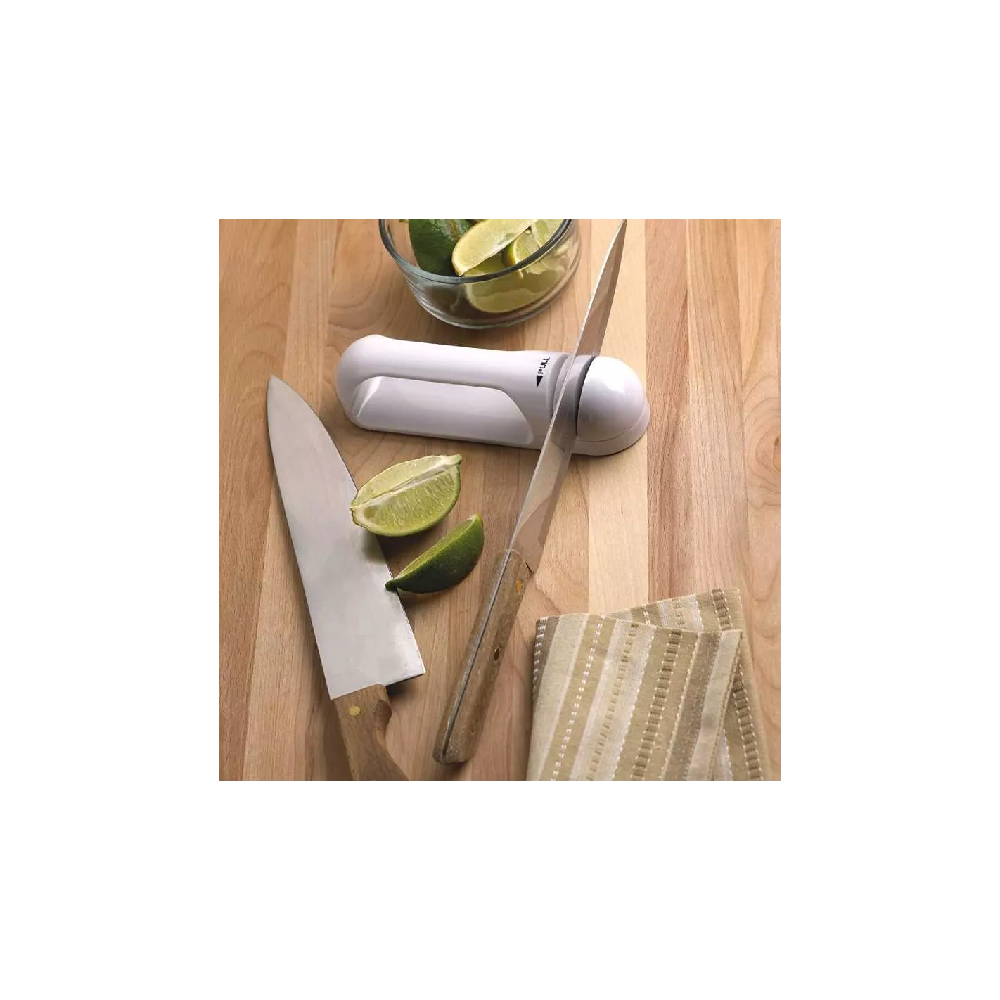 Deja de luchar para cortar con cuchillos desafilados. El uso diario crea desgaste, haciéndolas menos funcionales con el tiempo. Con este práctico afilador de cuchillos de dos etapas, puede mantener los cuchillos afilados para un mejor rendimiento. Hecho de plástico ABS duradero, el cabezal de corte en forma de V de esta herramienta hace maravillas en cuchillos dañados con su diseño de dos pasos. Para usar, simplemente coloque el afilador en una superficie de trabajo plana y sostenga el mango con una mano y el mango del cuchillo con la otra. Inserte el cuchillo completamente en la ranura en un ángulo de 90 grados con respecto al afilador y tire varias veces hacia atrás para afilar. Luego, use el lado cerámica de la unidad para terminar bien y pulir el borde. Una forma fácil y segura de revivir sus cuchillos más utilizados.ALTO: PULGADAS = 1.5