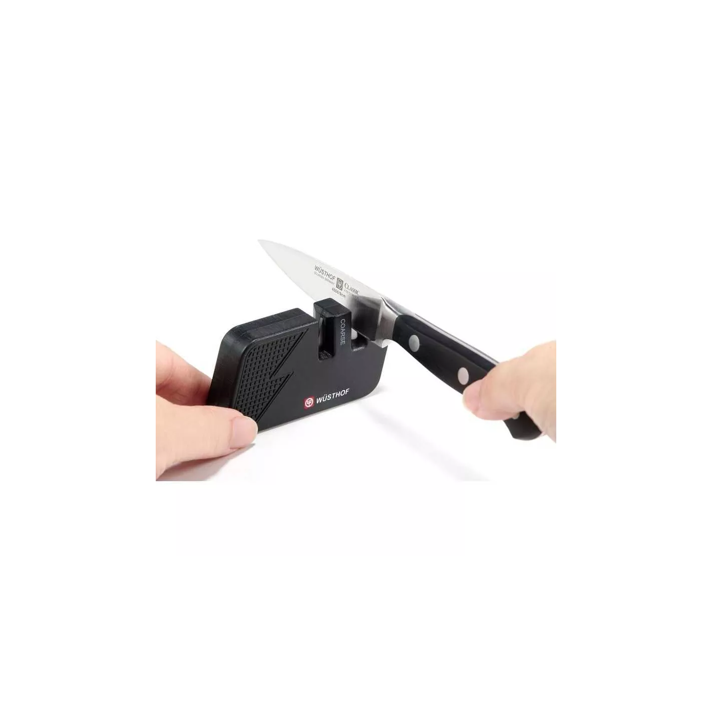 Elija entre dos niveles de afilado para su comodida. El nivel grueso se recomienda para cuando el cuchillo está completamente romo. El nivel fino se recomienda tanto para afilar fino como para reafilar regular. Las láminas de cerámica muelen la hoja y el cuchillo recupera su nitidez original. Recomendado para su area de cocina.