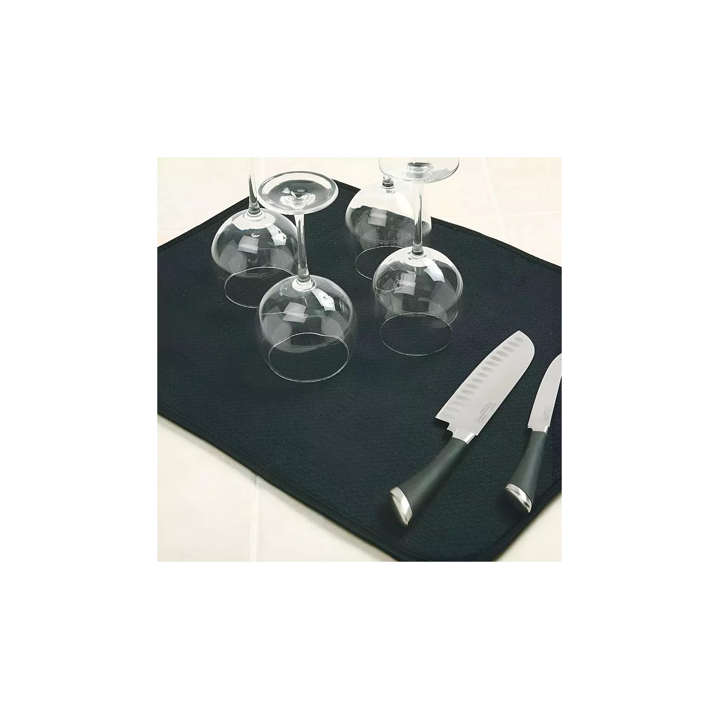 El diseño único tiene 4 veces su peso en agua al combinar una capa delgada de espuma entre dos capas de microfibra de alta calidad, extremadamente absorbentes y duraderas. Se seca más rápido que los paños de cocina ordinarios. Proporciona amortiguación para platos delicados y copas. Incluso protege su mostrador de rasguños cuando se coloca debajo de pequeños electrodomésticos. Incluye una lengüeta cosida en el costado del tapete, para colgarlo para que se seque. Se puede plegar para facilitar el almacenamientoANCHO: PULGADAS = 16
