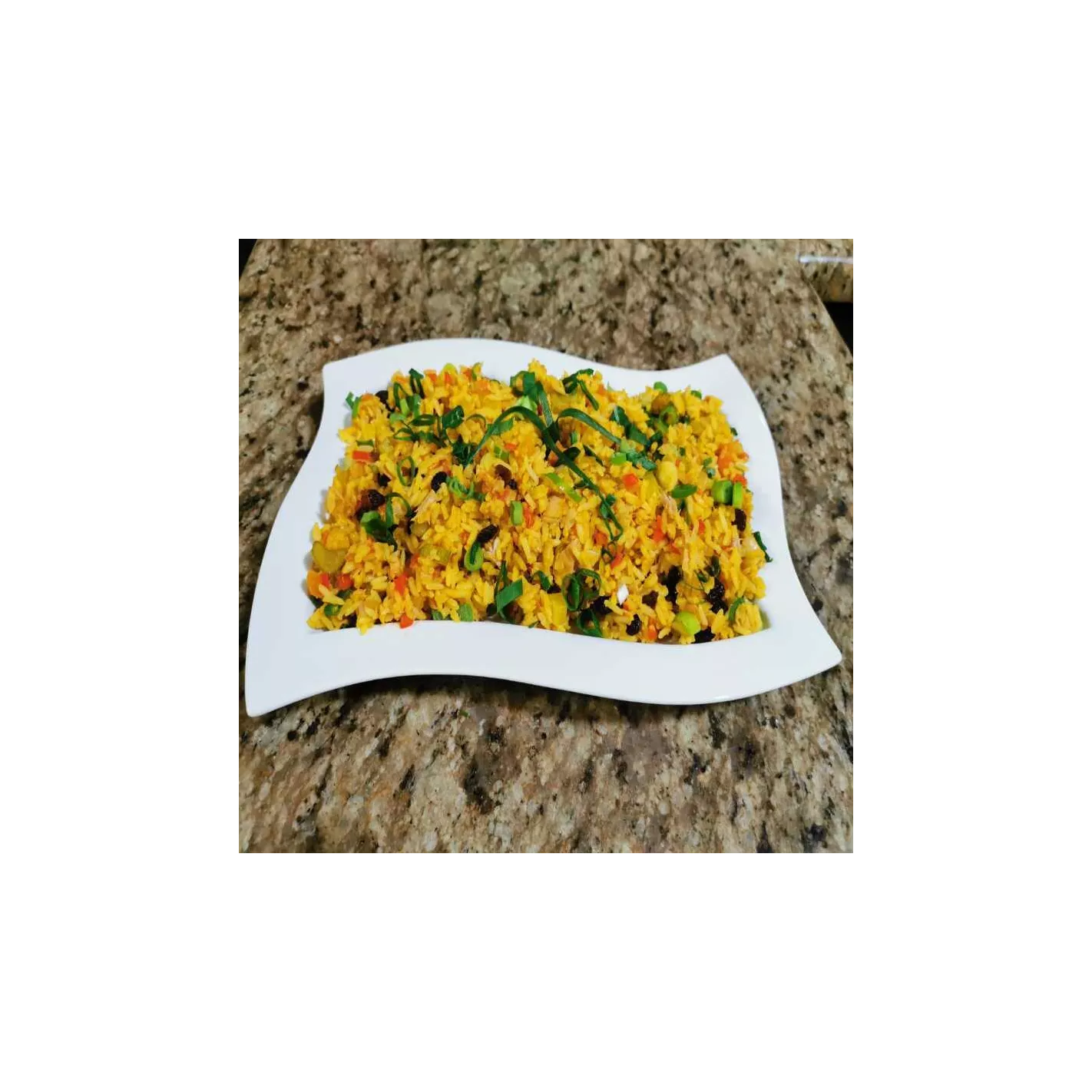 3.Por último añadimos arroz , atún, mezclamos y cocinamos durante 3 minutos ,incorporamos pasas y cebollinos.