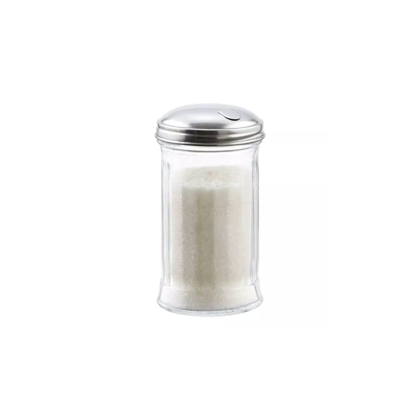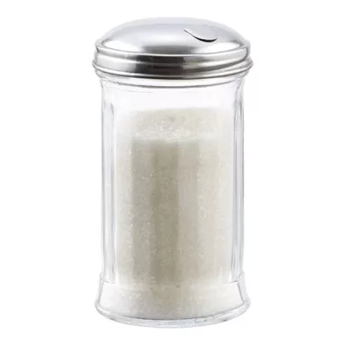 Clásico dispensador de azúcar con aleta en la tapa. Una buena manera de asegurar gran servicio al cliente, es que cada mesa cumpla con las necesidades básicas para satisfacer a la clientela y la azucarera es una herramienta indispensable.