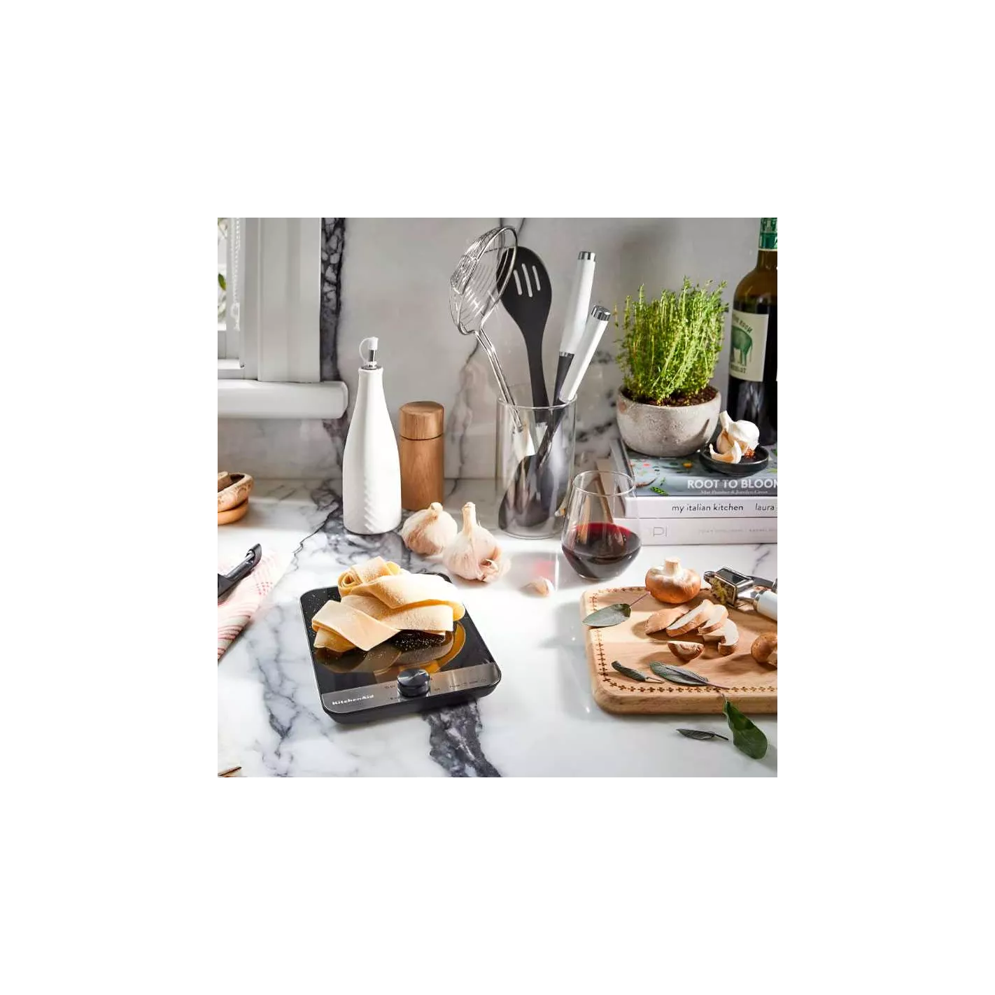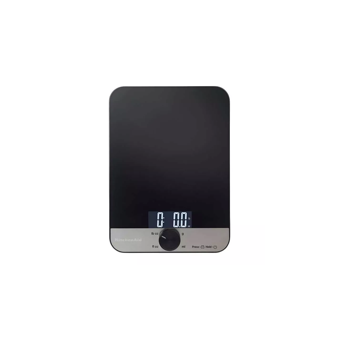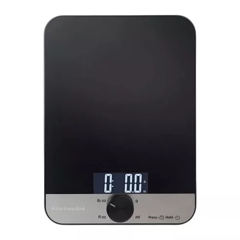 La elegante báscula de cocina de 5000 g con tapa de vidrio de KitchenAid presenta un atractivo borde de acero inoxidable y una perilla de gran tamaño para configurar las unidades de medida. El vidrio es una superficie que naturalmente no se mancha ni huele y está templado para mayor seguridad. La gran pantalla retroiluminada de 2,5 cm es fácil de leer. Una función de tara de "agregar y pesar" ayuda a poner a cero los pesos de los recipientes antes de agregar alimentos o pesar varios ingredientes juntos. Convierte cómodamente las medidas de líquidos y secos.