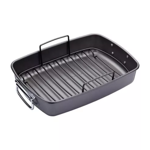 Con su construcción de acero al carbono de calidad comercial, revestimiento antiadherente especial y práctica rejilla para asar, es un verdadero "imprescindible" en la cocina para cualquier persona que ame los asados de domingo como es debido. Con su rejilla para asar antiadherente extraíble, permite que el calor de su horno circule de manera eficiente alrededor de su asado. Para las carnes asadas, esto ayuda a que la piel quede uniformemente crujiente y dorada sin quemarse ni hervir en aceite o jugos calientes. Cuando haya terminado de asar, simplemente levante la carne de la bandeja usando las cómodas asas. Como beneficio adicional, la rejilla también ayuda a que la grasa y los jugos gotee de la carne. Esto significa que obtendrá un resultado más saludable, o puede convertir los jugos recolectados en una deliciosa salsa.