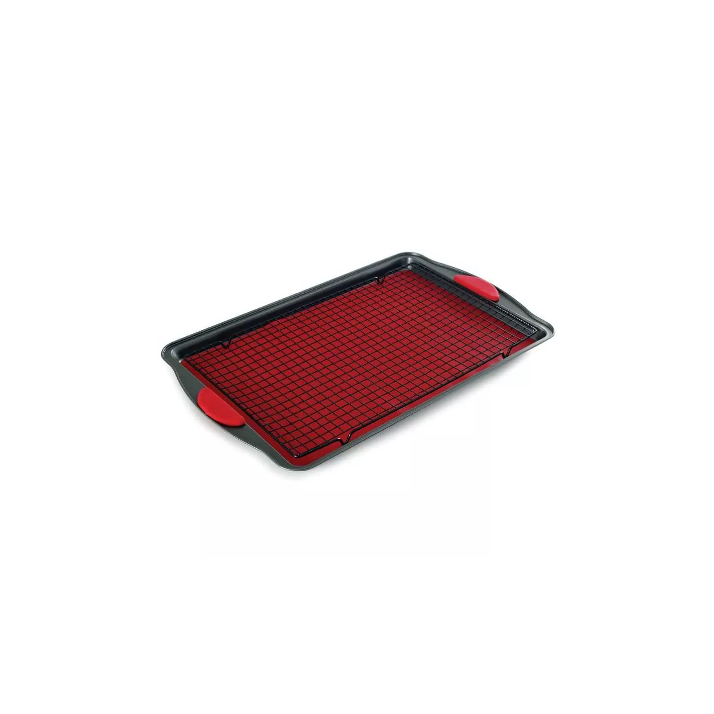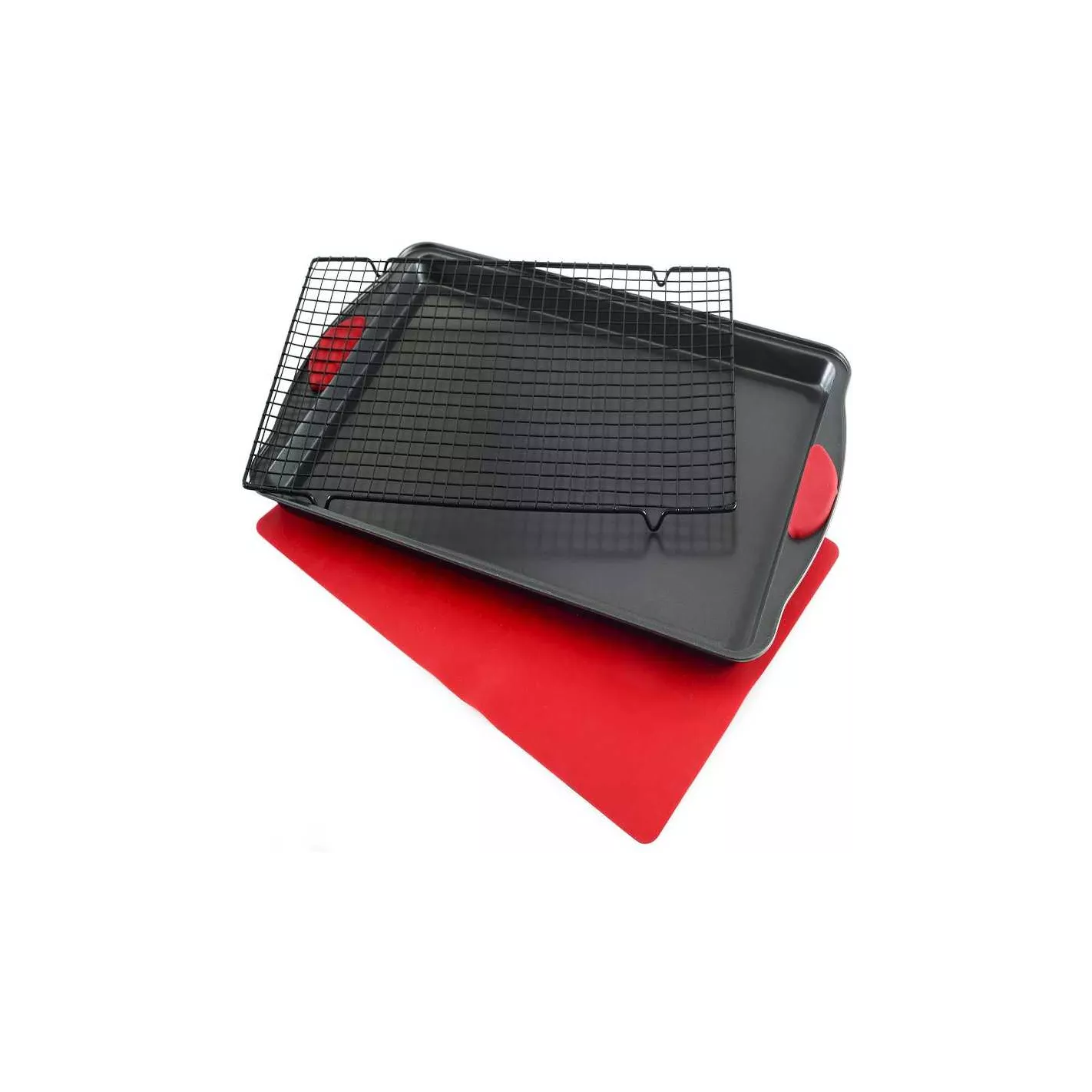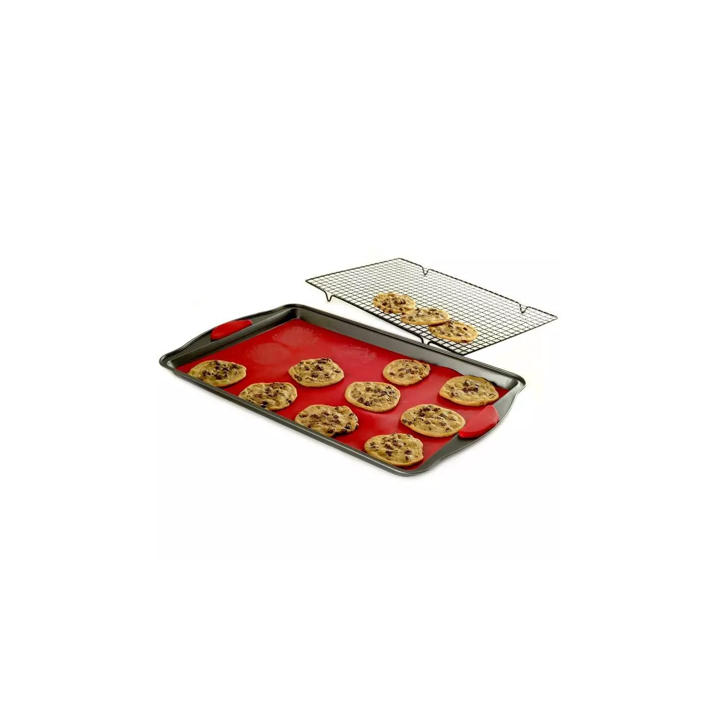 El juego para hornear incluye una bandeja para hornear antiadherente, una estera de silicona y una rejilla para enfriar. La bandeja para hornear antiadherente mide 49 x 30.5 x 2.5 centímetros