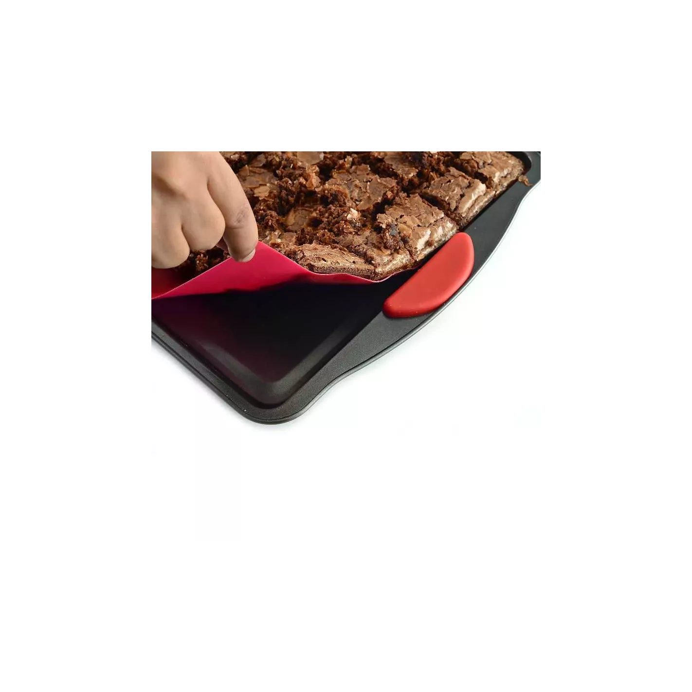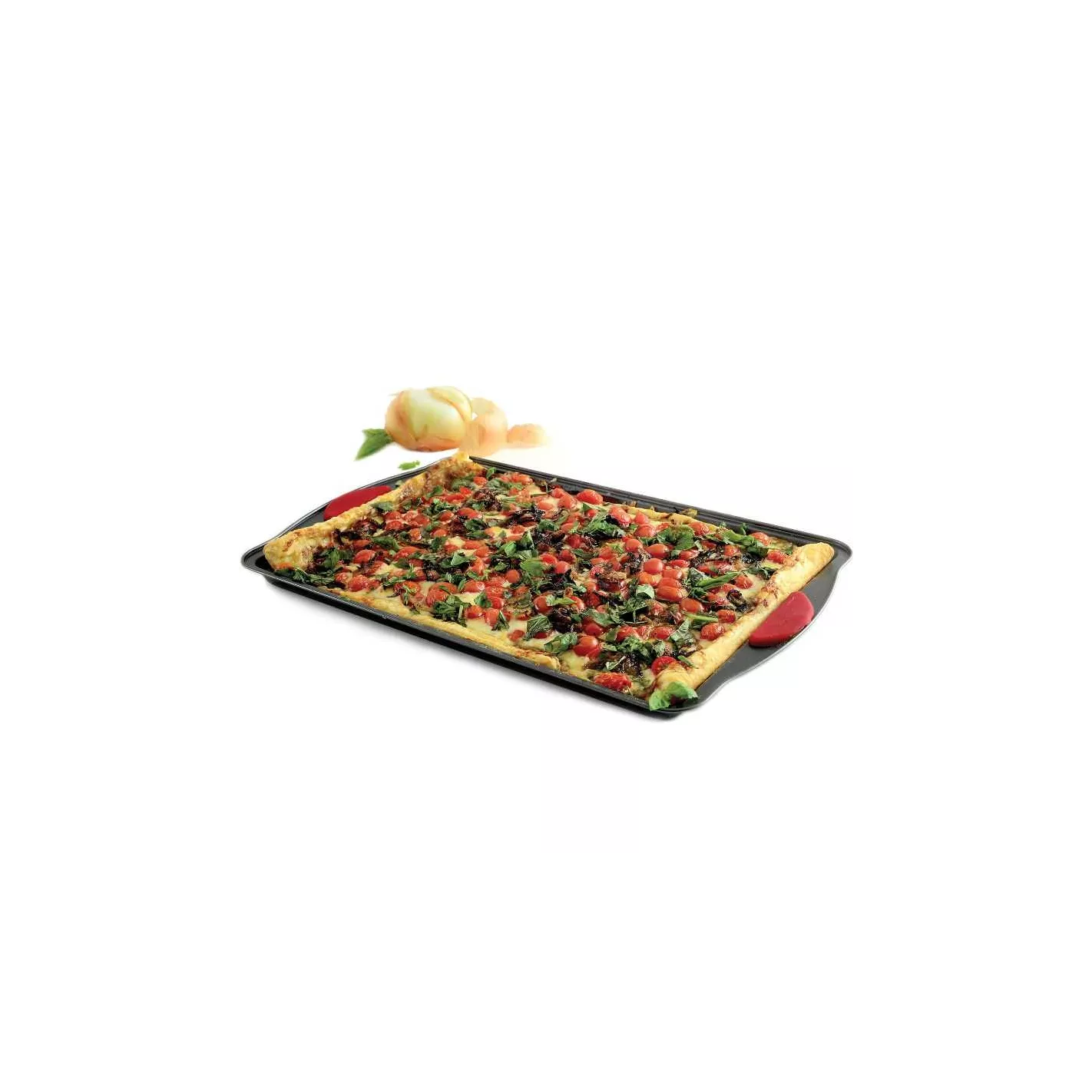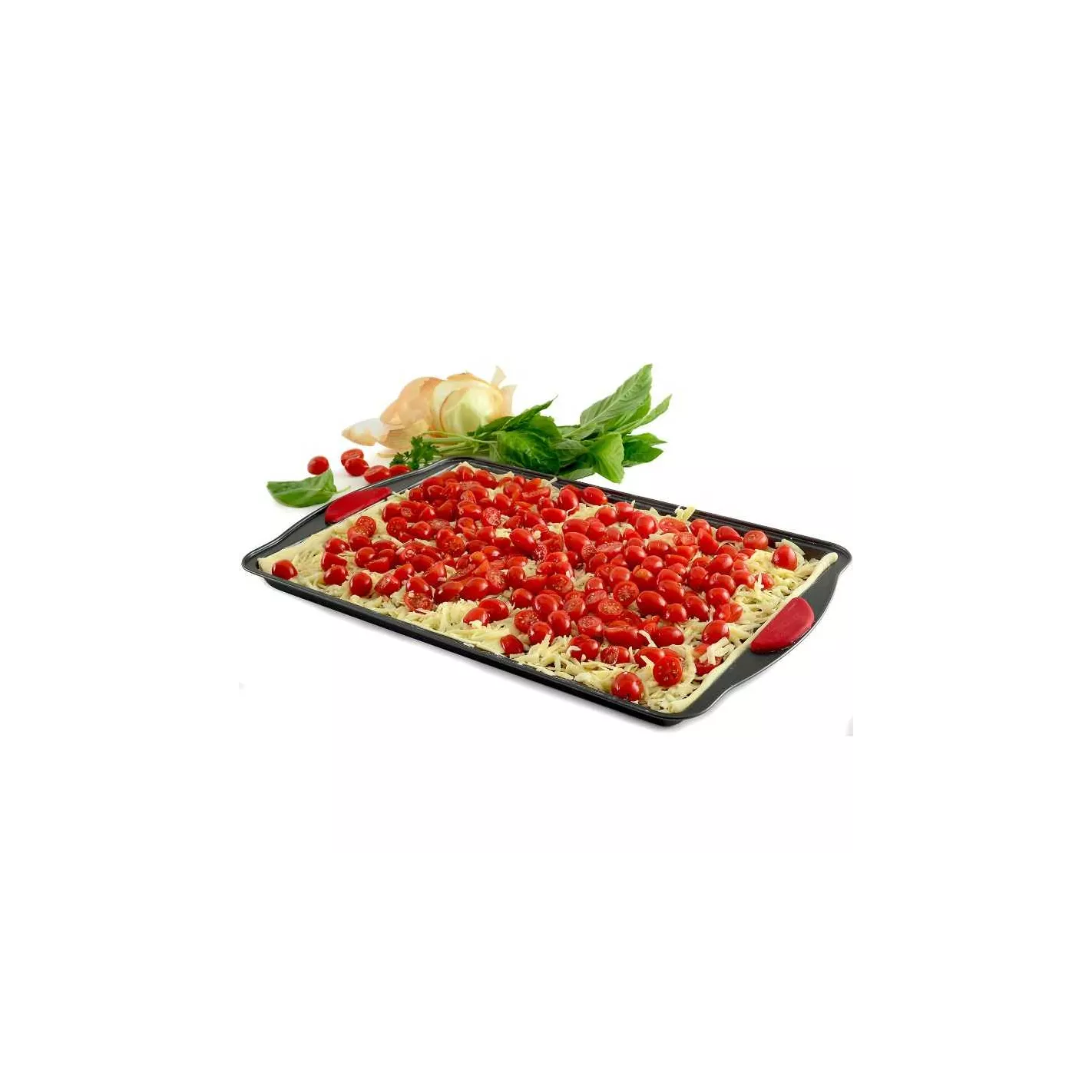 El juego para hornear incluye una bandeja para hornear antiadherente, una estera de silicona y una rejilla para enfriar. La bandeja para hornear antiadherente mide 49 x 30.5 x 2.5 centímetros