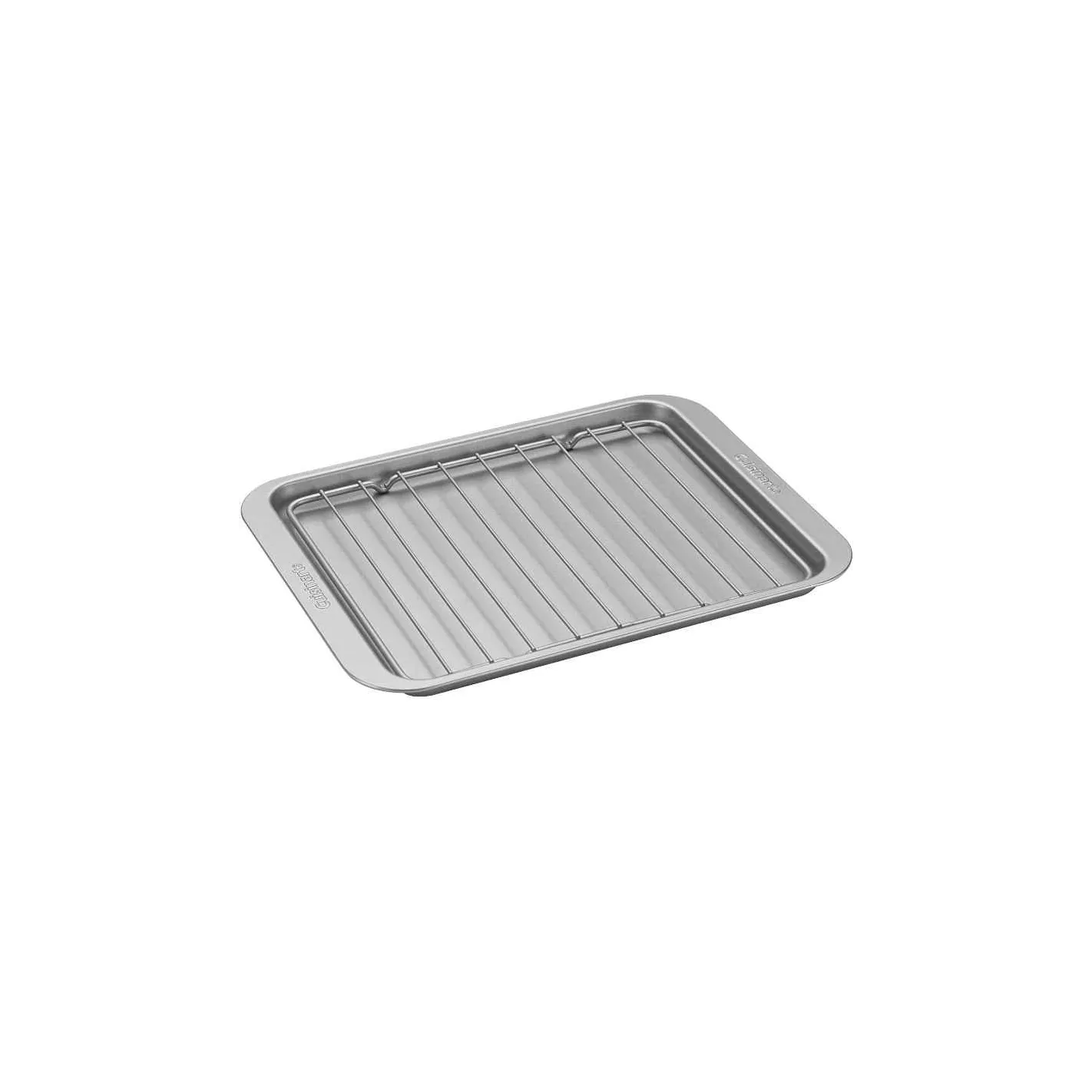 La línea de utensilios para horno tostador está fabricada con acero aluminizado de calibre pesado para proporcionar una distribución uniforme del calor y resultados consistentes de horneado. El interior y exterior antiadherente garantizan una fácil liberación de alimentos y limpieza, y toda la línea es apta para lavavajillas.
