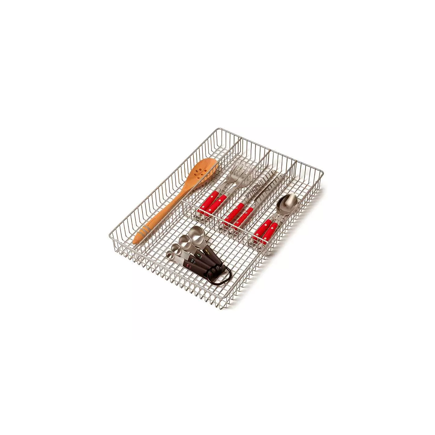 Ordena los cajones de la cocina con esta bandeja compacta para cubiertos. Mantén los cubiertos en compartimentos separados para que sea más fácil agarrar un tenedor, una cuchara o un cuchillo. Nunca más pierdas tu abrebotellas o sacacorchos favorito. Esta bandeja de cinco secciones también es ideal para organizar los suministros de oficina. El compartimento adicional a lo largo de la parte inferior es perfecto para accesorios de cocina adicionales, como un sacacorchos de vino, un abrebotellas, un pelador de verduras, una espátula u otro utensilio de cocina. La base de acero resistente se asienta de manera uniforme en los cajones de la cocina.