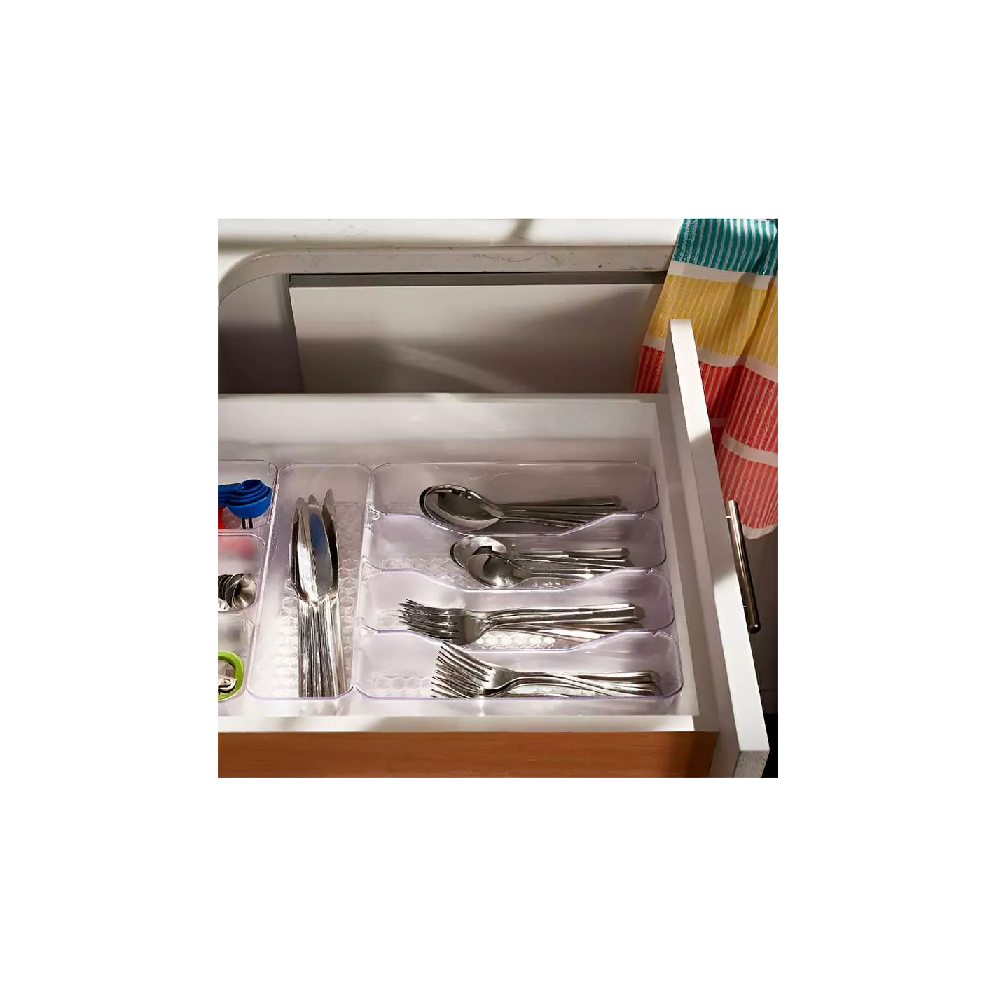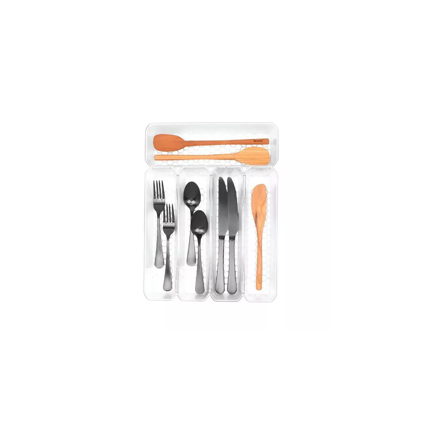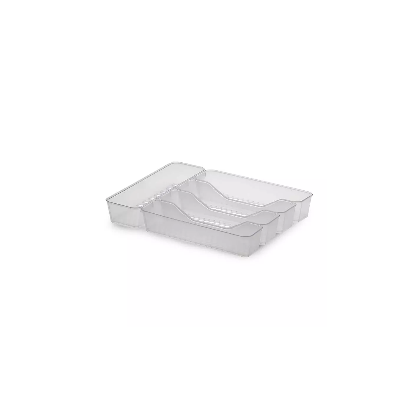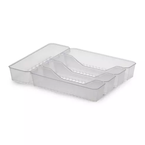Guarda tus cubiertos de forma segura en la atractiva bandeja para cubiertos Spectrum HEXA® con 5 separadores. Los separadores curvos separan los cubiertos, lo que facilita tomar lo que necesitas, por lo que poner la mesa es rápido y sencillo. La bandeja para cubiertos se combina con otros organizadores de cajones HEXA para mantener tu cajón de cubiertos ordenado y prolijo. Moderno y funcional, el color transparente esmerilado combina con cualquier decoración, mientras que los tamaños de los compartimentos brindan suficiente capacidad para múltiples utensilios.