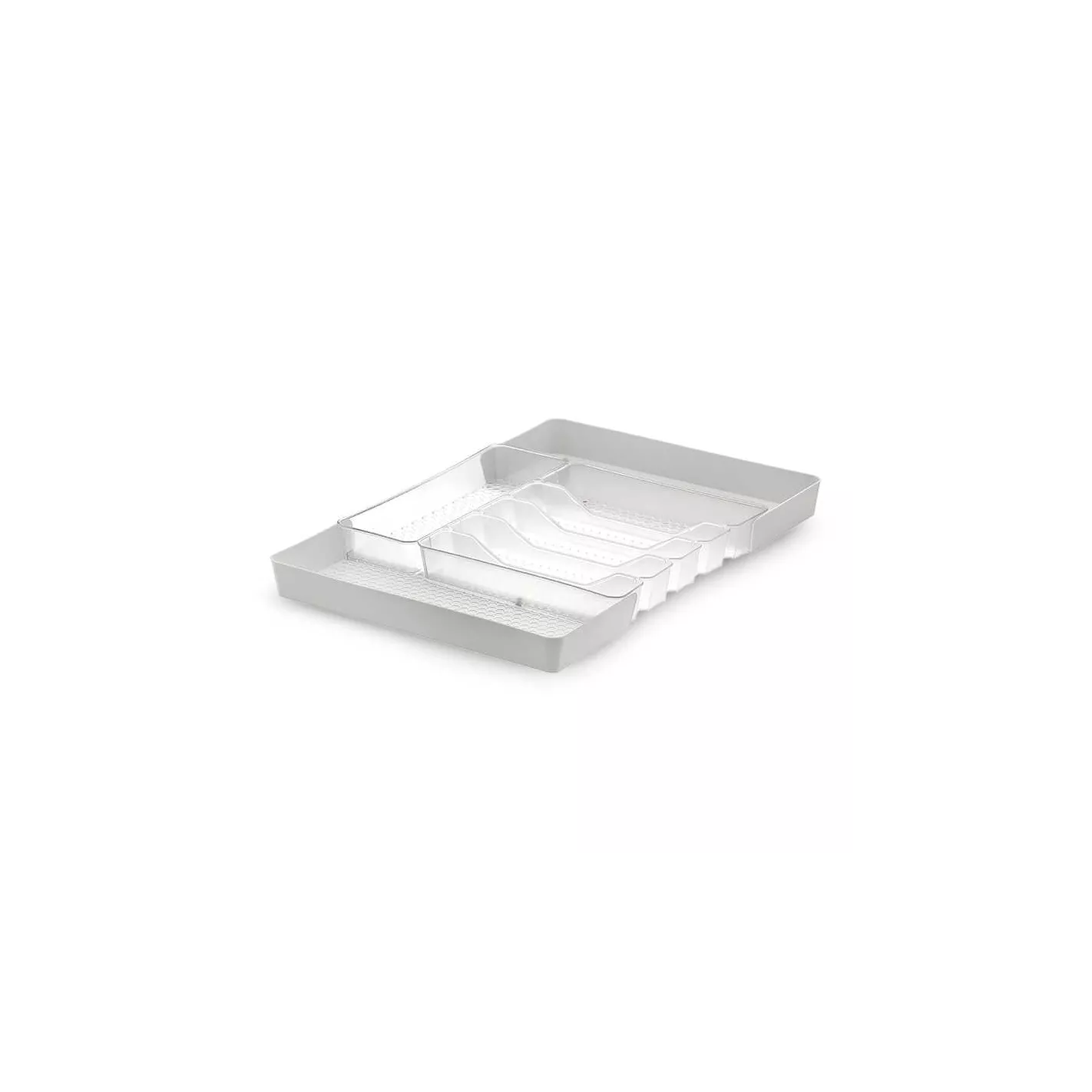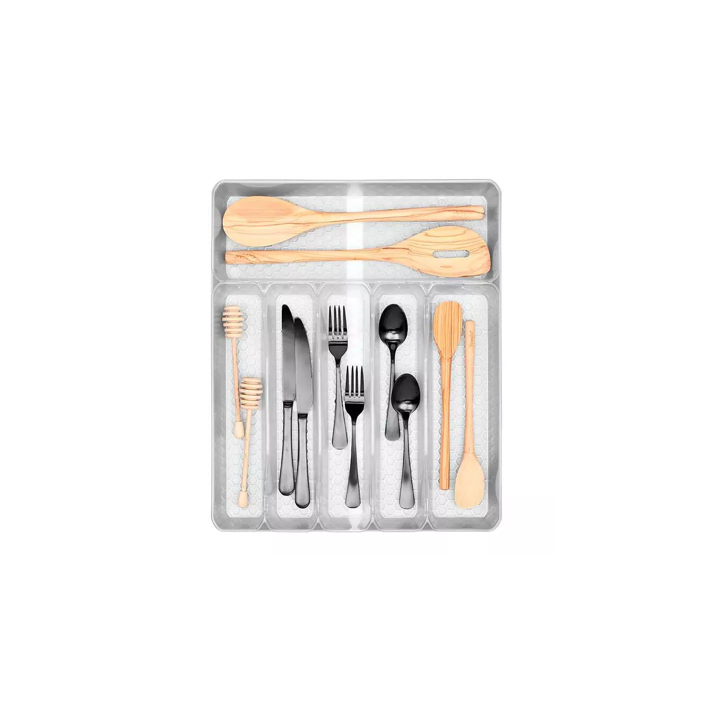 Si busca una solución para cubiertos que vaya un paso más allá, elija la bandeja para cubiertos expandible con 6 compartimentos HEXA®. Además del diseño estándar de seis compartimentos, este organizador cuenta con dos secciones deslizables adicionales que se bloquean en su lugar para obtener aún más capacidad de almacenamiento. Los divisores curvos separan los cubiertos para que pueda tomar rápidamente lo que necesita, mientras que la combinación de colores transparente escarchado y gris piedra agrega un toque único a su cajón para cubiertos.