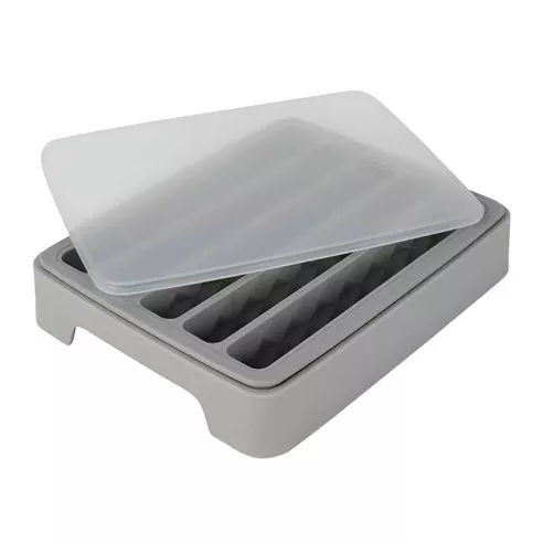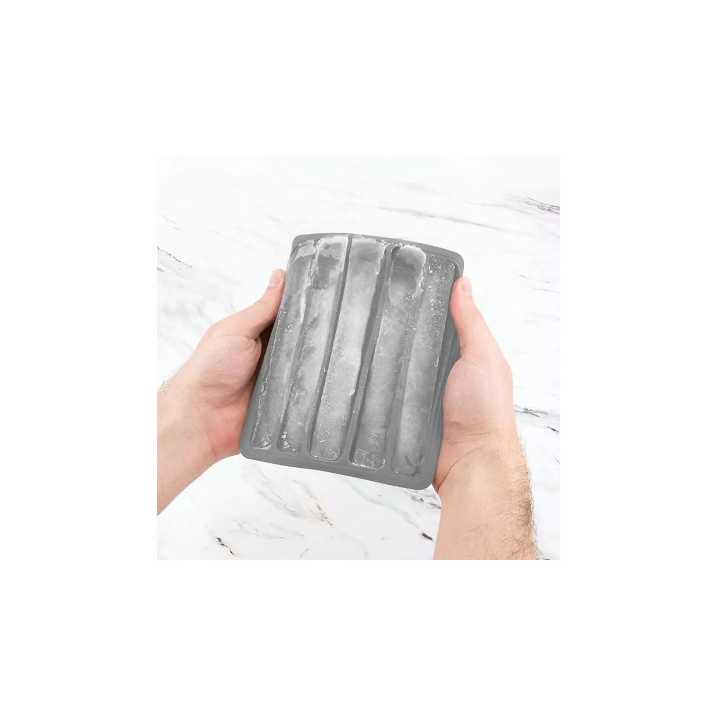 Esta innovadora bandeja para cubitos de hielo en botella crea 5 palitos de hielo cilíndricos de 1,5 oz que se adaptan a las aberturas de las botellas reutilizables y compradas en tiendas de cuello estrecho, para que las bebidas se mantengan frías durante más tiempo. Los palitos de hielo largos y cilíndricos se adaptan a la mayoría de las botellas reutilizables y compradas en tiendas de cuello estrecho. La silicona duradera de grado alimenticio permite quitar fácilmente uno o dos cubitos a la vez, para que puedas disfrutar de tus bebidas con tanto hielo como quieras. La tapa de ajuste hermético sella los olores y permite apilar. La tapa crea un sello al encajar en el borde de silicona, y la base estable encaja perfectamente sobre la tapa de otra bandeja, por lo que puedes apilar varias bandejas de hielo de silicona.