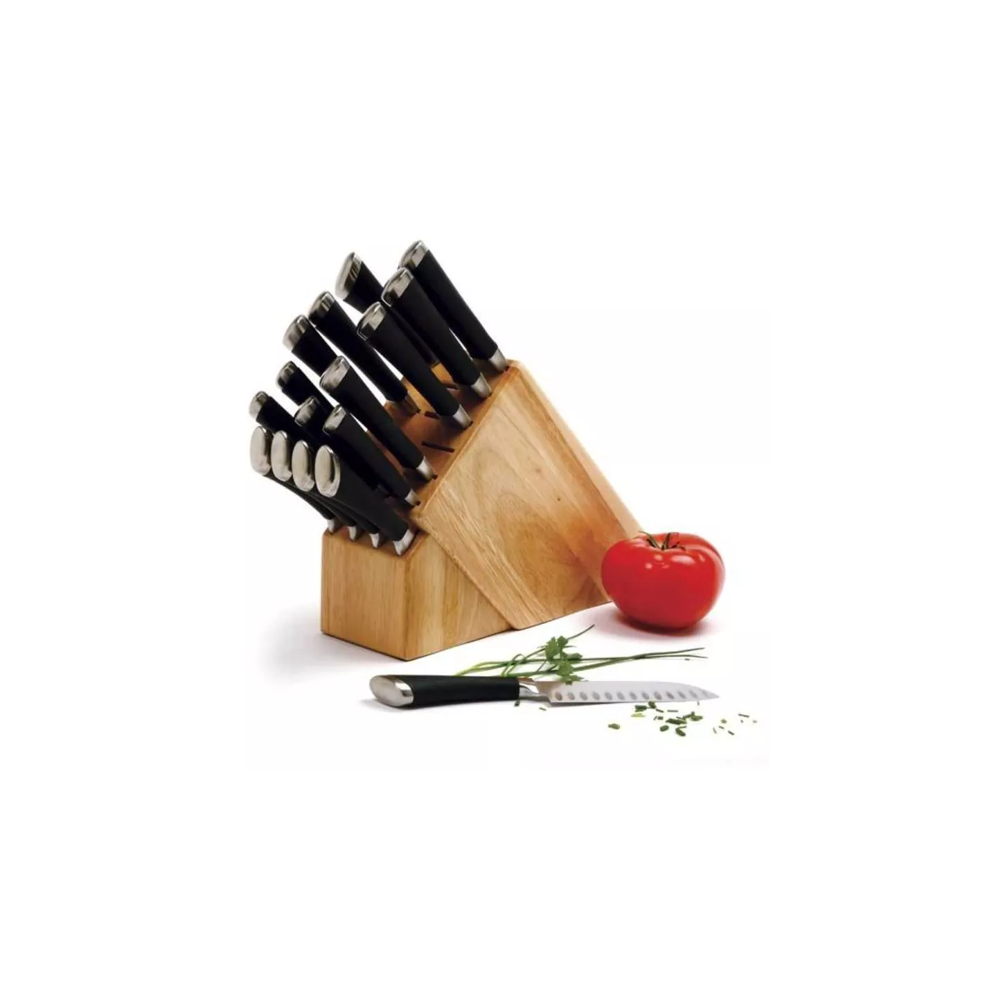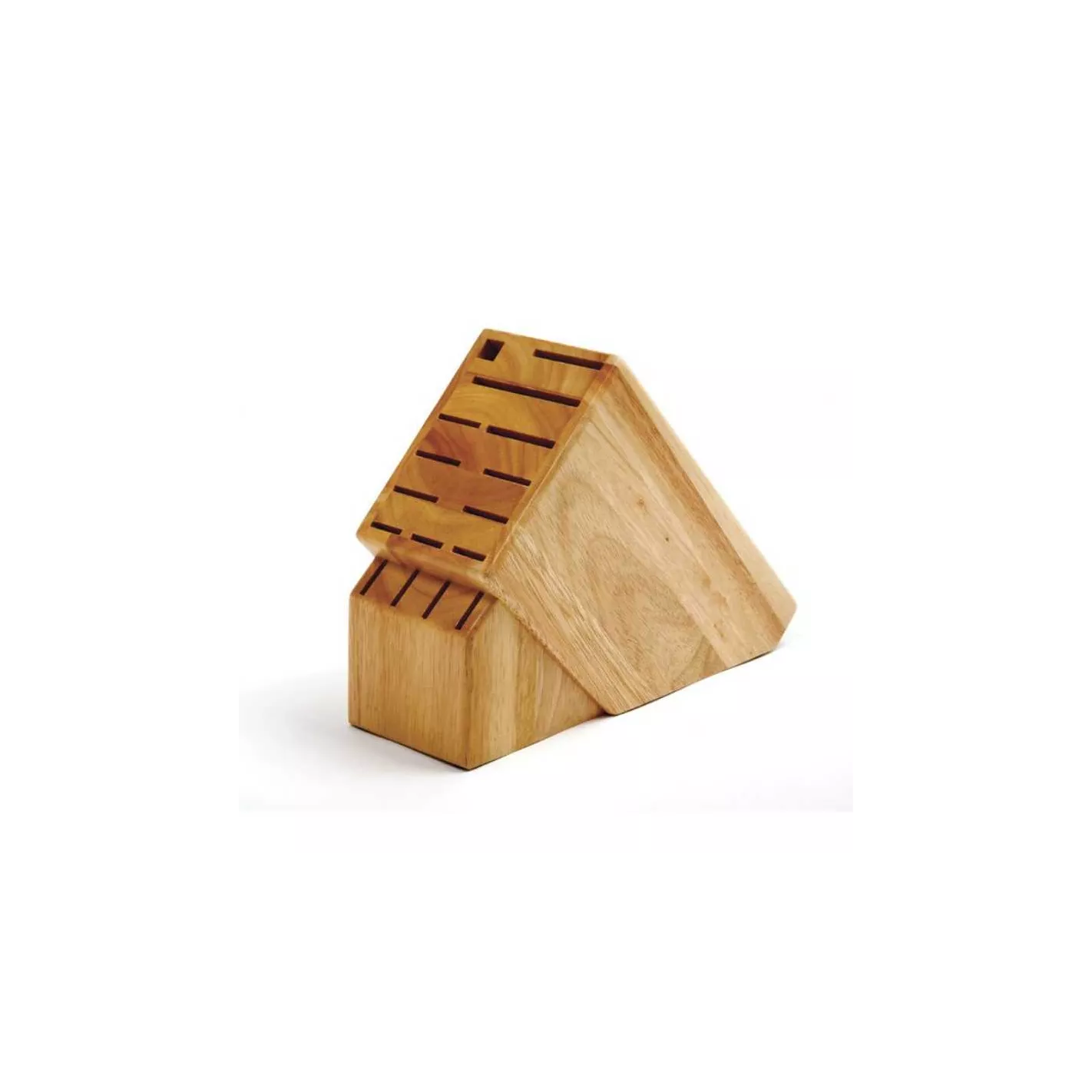El bloque de cuchillos de madera natural tiene 16 ranuras e incluye un afilador y 4 ranuras para cuchillos de carne. Contiene patas de goma para proteger su encimera.
