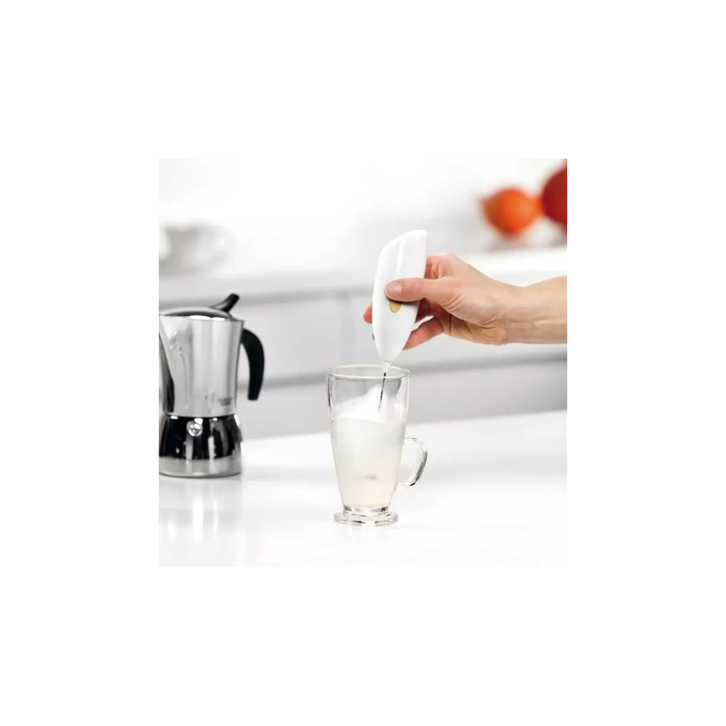 Excelente para una preparación rápida de espuma de leche para capuchino, café con leche, chocolate caliente, etc. Caliente la leche (idealmente entera/semidesnatada) a 60°C y viértala en un recipiente alto y estrecho. Sumerja el batidor en la leche, enciéndalo y bata hasta que la espuma se espese (15 a 20 segundos)
