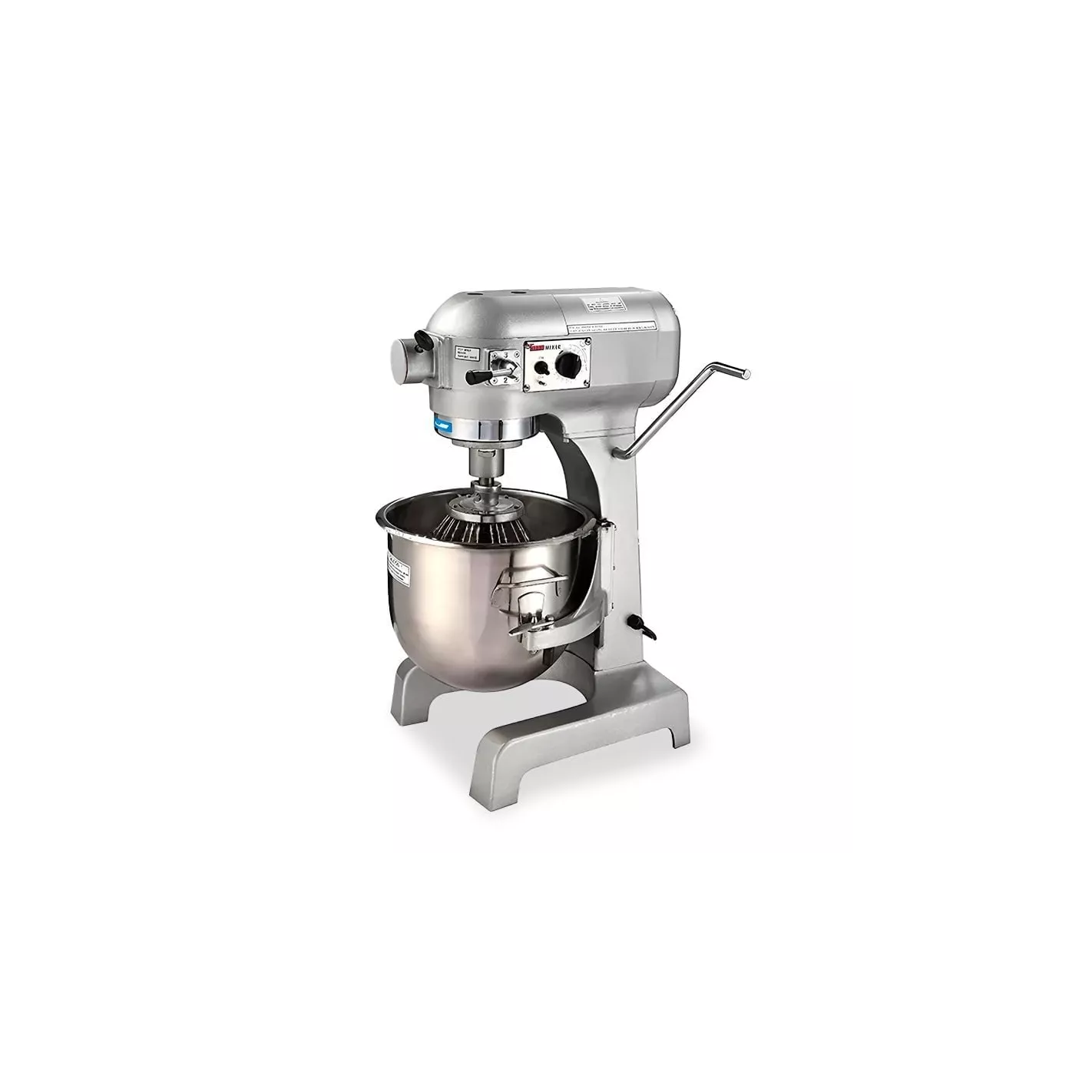 Esta batidora tiene 1/2 h.p, refrigerado por aire, 110 V / 60/1 (50 Hz disponible), panel de control en el lateral, equipado con interruptor de ENCENDIDO / APAGADO de serie. El temporizador es opcional, cable flexible de tres hilos y clavija de tierra de 6 pies. Los engranajes están empaquetados con una grasa de alta presión de larga duración. Los engranajes planetarios son impulsados por un enlace directo al eje de transmisión del motor. Este diseño produce una potencia de mezcla de alto par. El equipo incluye un tazón de 20 quartos gancho para masa, batidor plano y globo de acero inoxidable de alta calidad. Una robusta palanca de mano en la columna del cuerpo sube y baja la taza y se bloquea en su lugar en las posiciones superior e inferior.