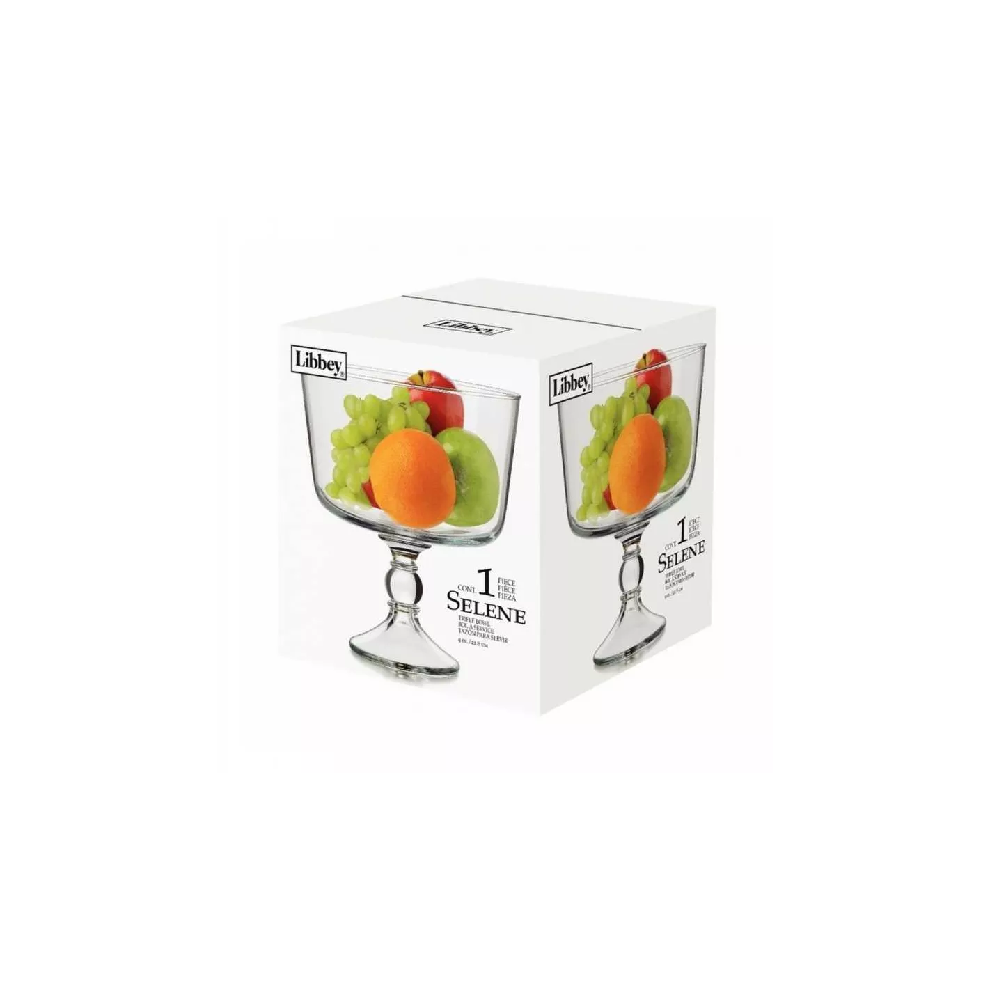 Frutero Selene / bombonera tiene un diámetro de 22.9 centimetros. Creado por una fábrica de vidrio de calidad reconocida por el mercado mexicano, y por otros países como Brasil. Los contenedores tienen durabilidad, diseño y transparencia. La bombonera tiene un diseño de base recta, palo largo con detalles en el palo y sin tapa.