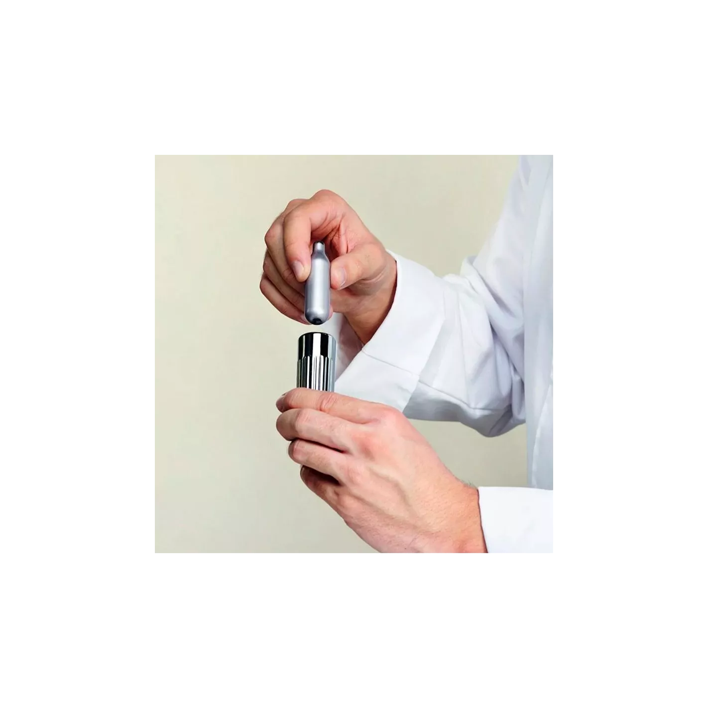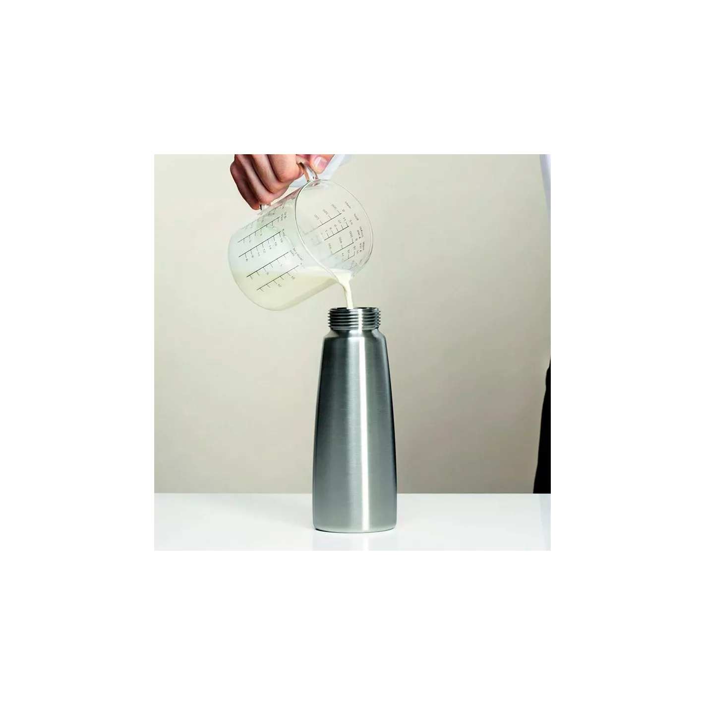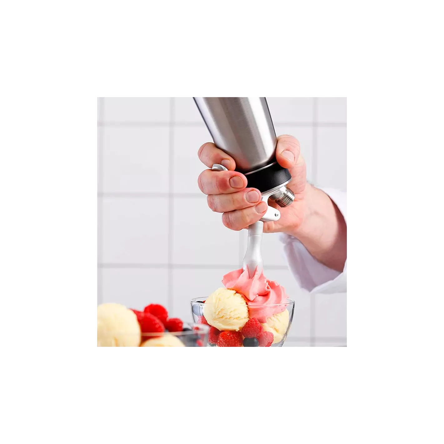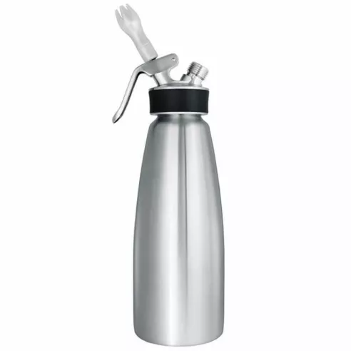 Es una herramienta clave en la preparación platos, postres y creaciones con espumas, incorporando variados ingredientes, colores y sabores de la cocina. Para la preparación de nata montada, nata aromatizada, espumas frías y postres deliciosos. Produce hasta el doble de cantidad de nata montada en comparación con otros métodos de montado. El sifón de nata profesional para cafeterías, heladerías, confiterías, etc. Botella y cabezal de acero inoxidable, desarrollados para el uso profesional. Cabezal con mango protector de silicona y válvula de acero inoxidable desmontable para facilitar la limpieza.