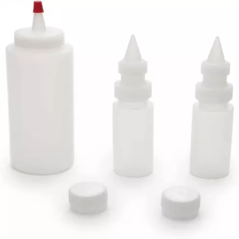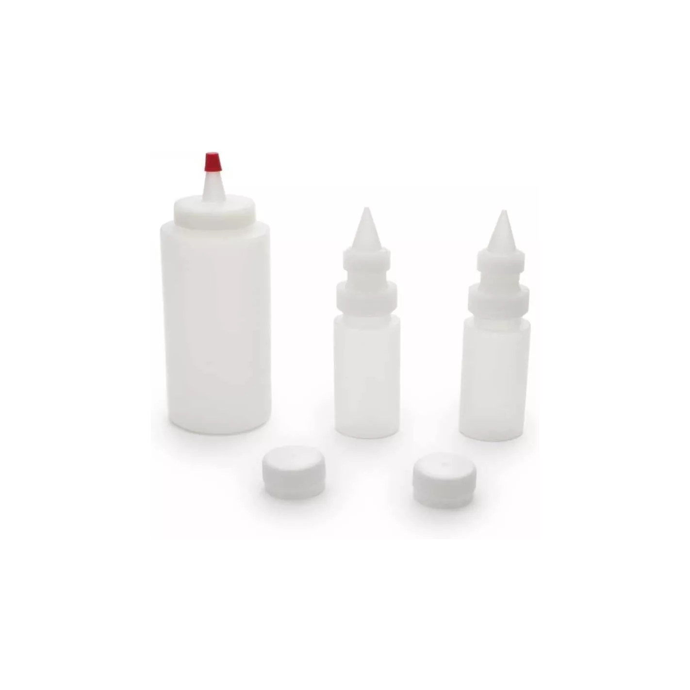 ¡Este conjunto de tres botellas con puntas y acopladores proporciona una manera fácil de obtener resultados fantásticos! Se incluyen dos botellas pequeñas que contienen cada una (2 onzas / 60 mililitros) y una botella grande que contiene (10 onzas / 300 mililitros) y tapas para cada botella. Hecho de falato y sin BPA. Estas botellas fáciles de exprimir son perfectas para dispensar glaseado y salsas para postres para decorar magdalenas, pasteles, galletas y helados con extremo detalle y precisión mediante el uso de puntas de presión de apertura redonda para remolinos de flores o mensajes. Decorar y diseñar con tres diferentes colores a la vez y experimente la facilidad de usar botellas decorativas precisas en lugar de bolsas de glaseado desordenadas. Estas versátiles botellas multiusos también se pueden usar para aderezos, salsas, condimentos, pinturas, pegamentos, artesanías y mucho más. ¡Deje volar su imaginación! Lave a mano para obtener los mejores resultados. Apto para lavavajillas en la rejilla superior