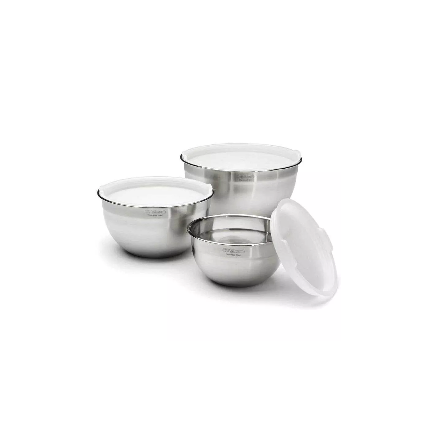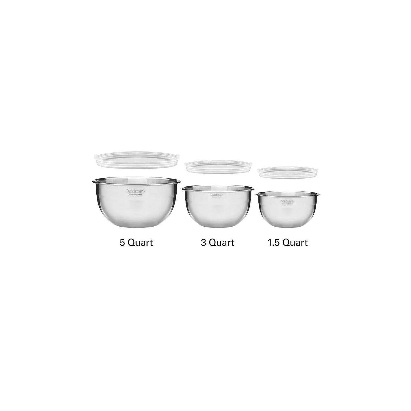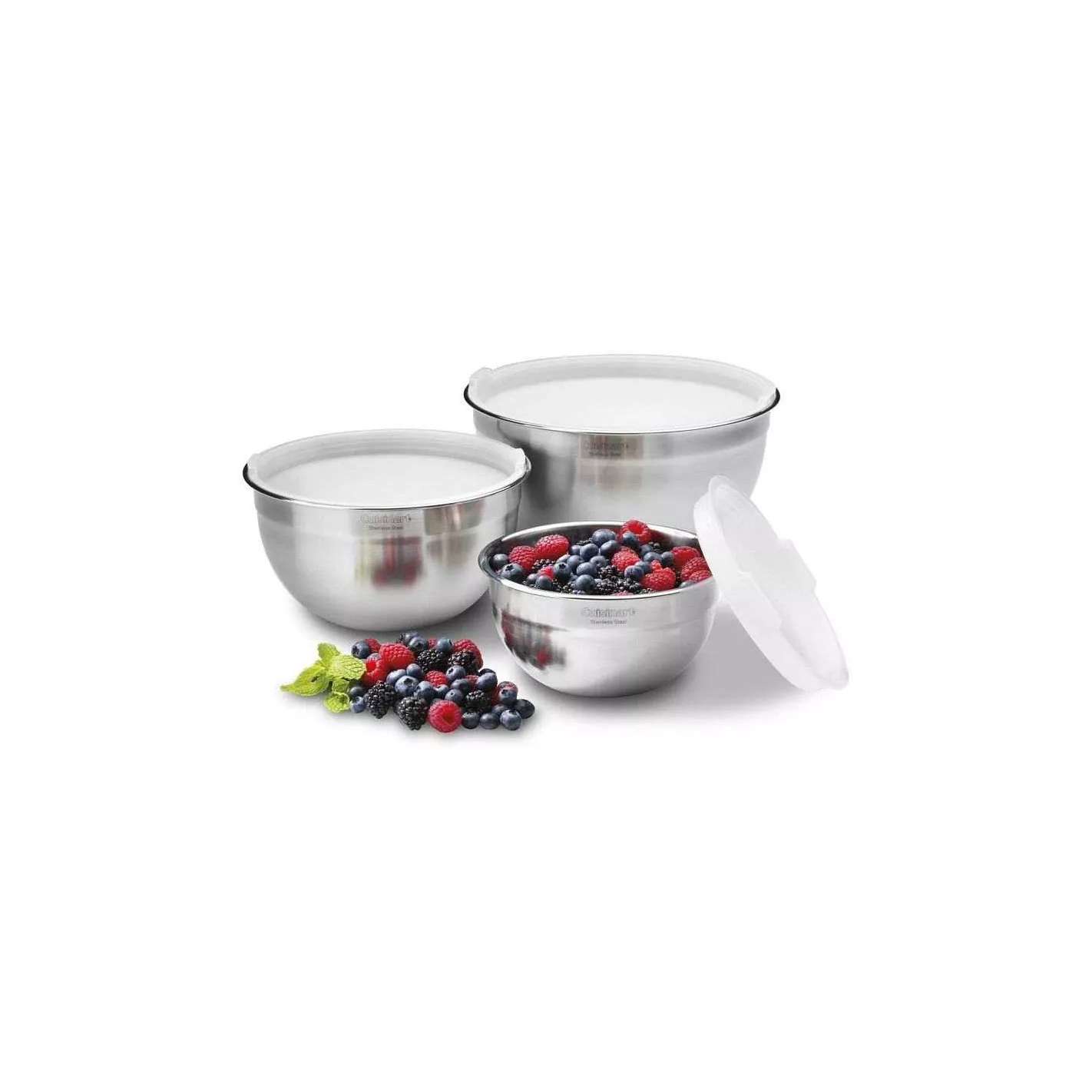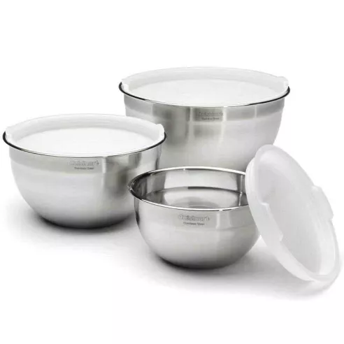 Recipientes de acero inoxidable Cuisinart para ahorrar espacio, además tienen tapas para almacenar las sobras en el refrigerador o el congelador. Tres tamaños que manejaran cualquier tarea que se requiera.