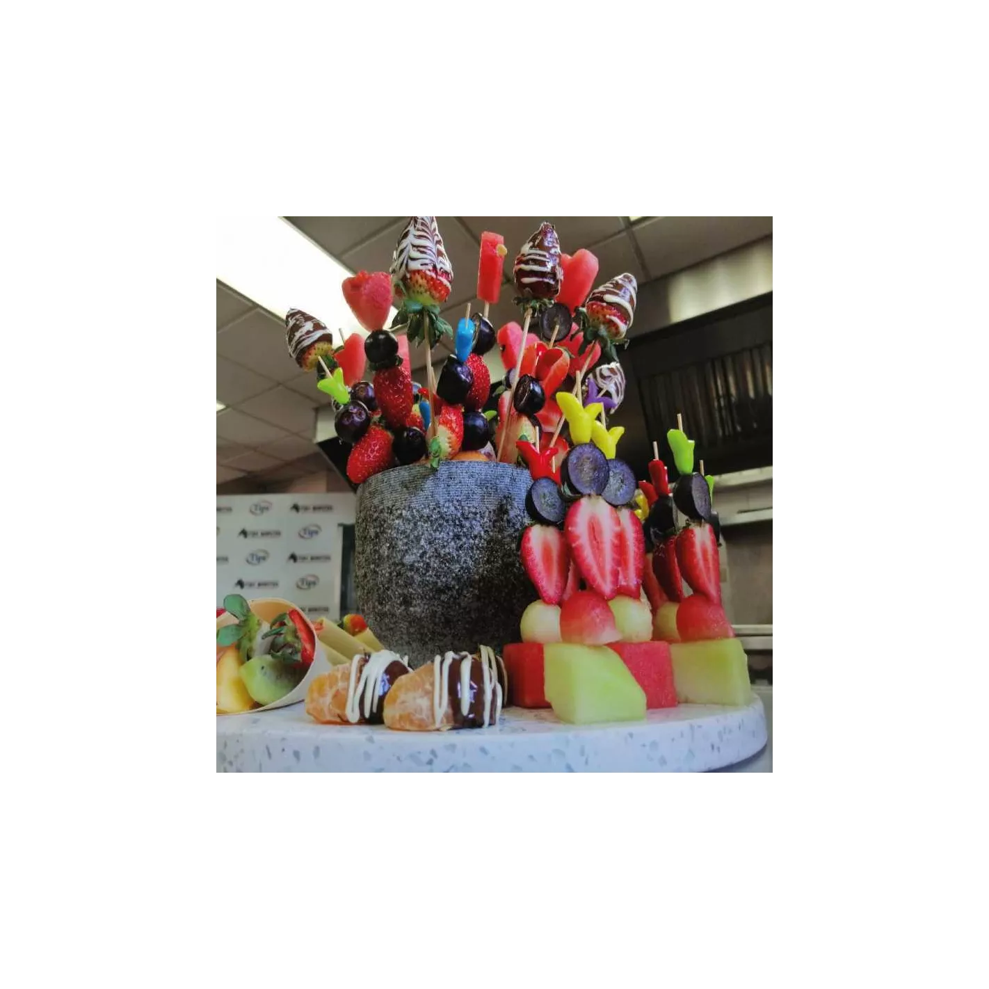 5-Armar las brochetas y cortar el resto de las frutas en diferentes formas.