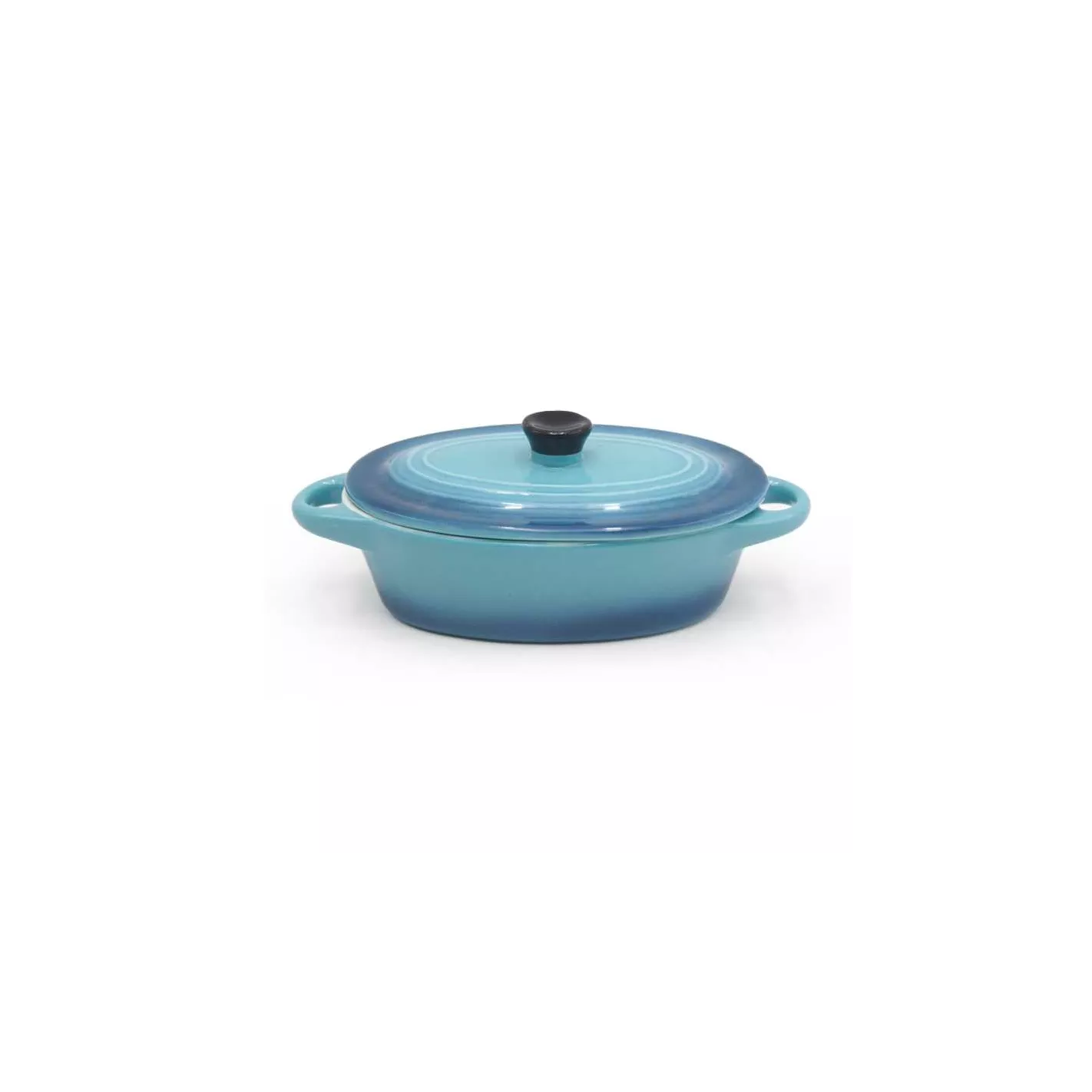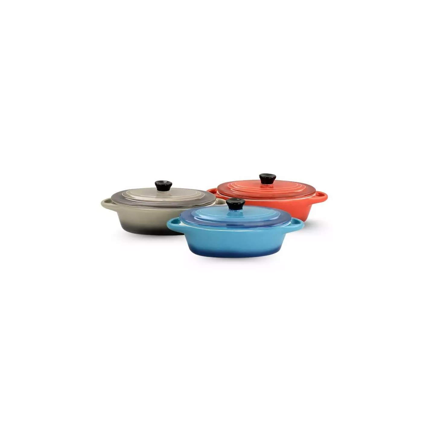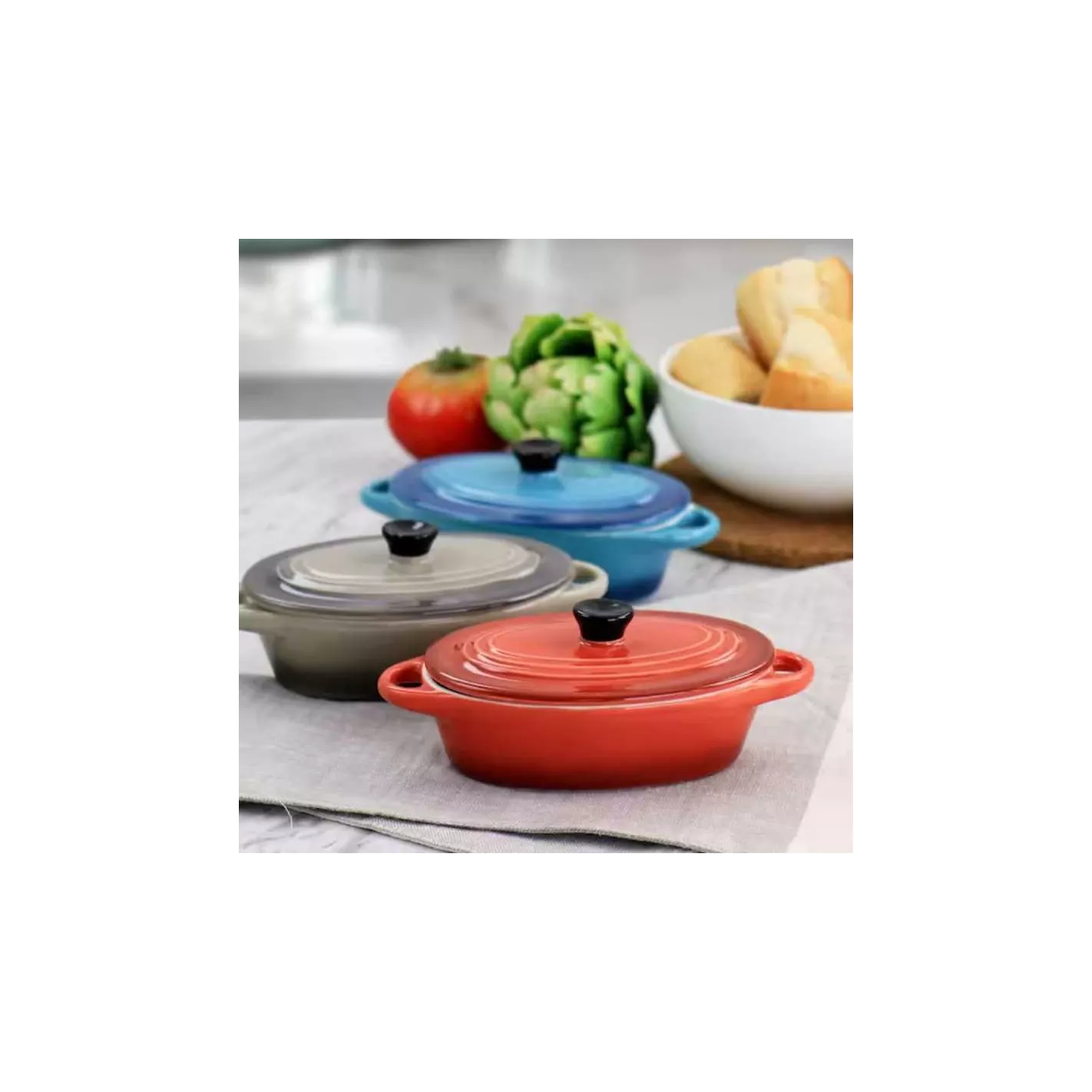 Estás minicacerolas son perfectas para servir guarniciones, postres, pudines, salsas y más. Se pueden encontrar en varios colores como en azul, rojo y gris, cada una con su propia tapa y asas laterales para transportarlas fácilmente del horno a la mesa. Apto para lavavajillas, microondas y horno, para usos múltiples y versatilidad. Acabado con un brillo degradado.