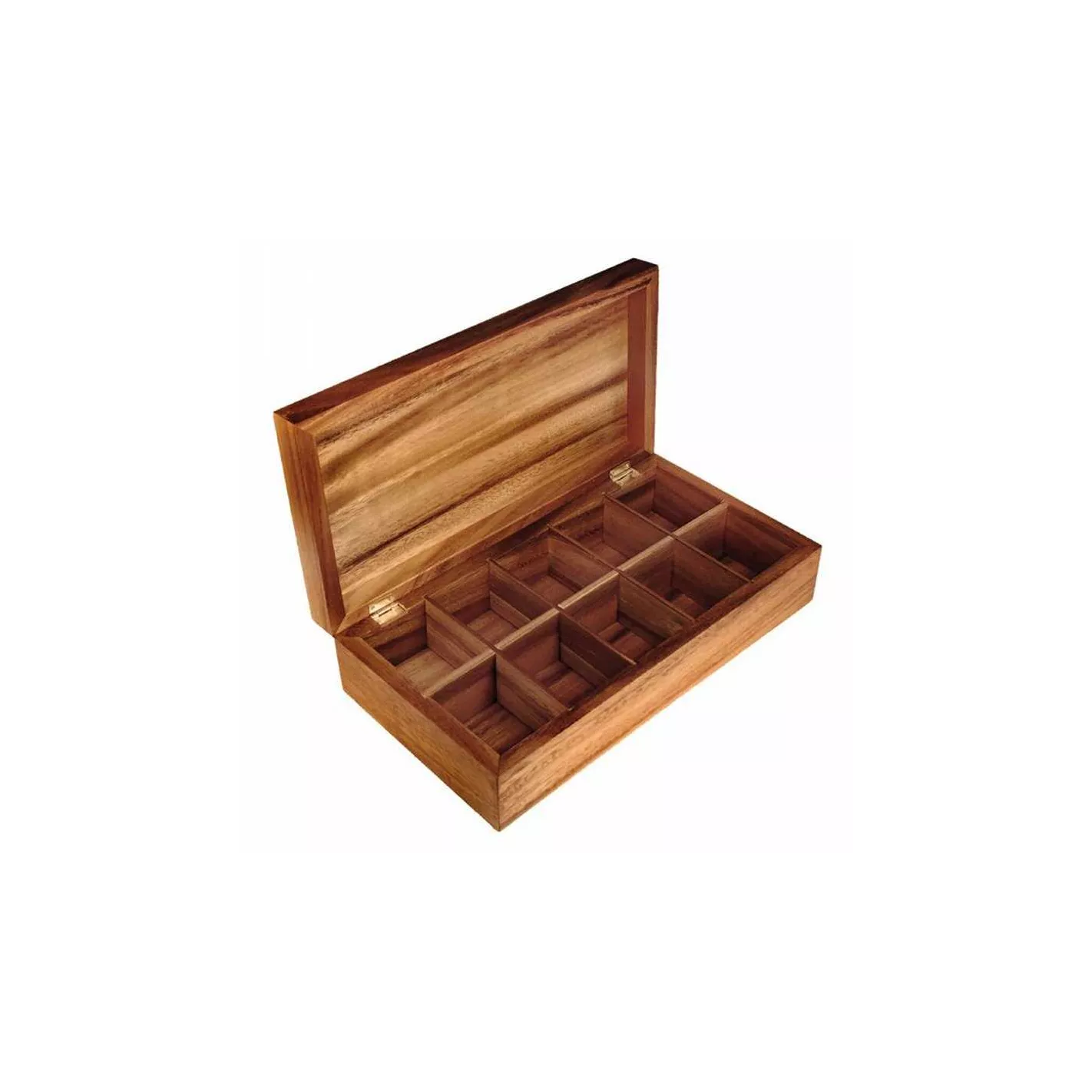 Esta caja de té cuenta con 10 compartimentos para un fácil surtido de té. Hecha de magnífica madera de acacia, esta caja es funcional y hermosa debido a sus colores ricos y brillantes. Su atractivo diseño aportará un toque agradable y cálido y una organización a cualquier cocina.