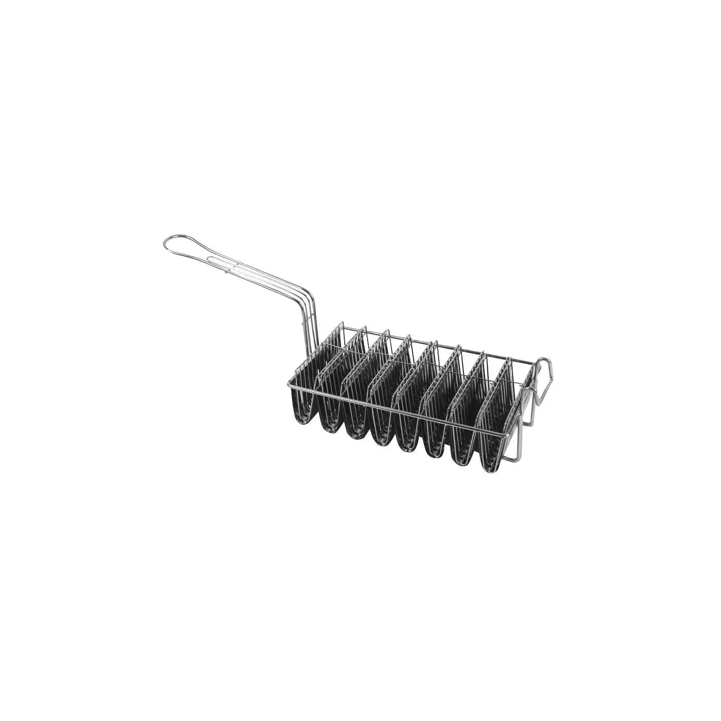 Use las cestas de tacos de 8 montículos para crear auténticos cascos de tacos caseros. Con una construcción duradera niquelada, esta cesta de tacos es lo suficientemente fuerte como para soportar altas temperaturas sin deformarse ni doblarse. Gracias a su mango en ángulo, esta pieza mantiene sus manos lejos del calor de forma segura mientras proporciona un agarre cómodo. Perfecto para configuraciones de alto volumen, esta cesta de tacos moldea hasta 8 conchas por carga y está construida con un gancho de caldera para freír para que pueda colgarse del lado de una freidora.