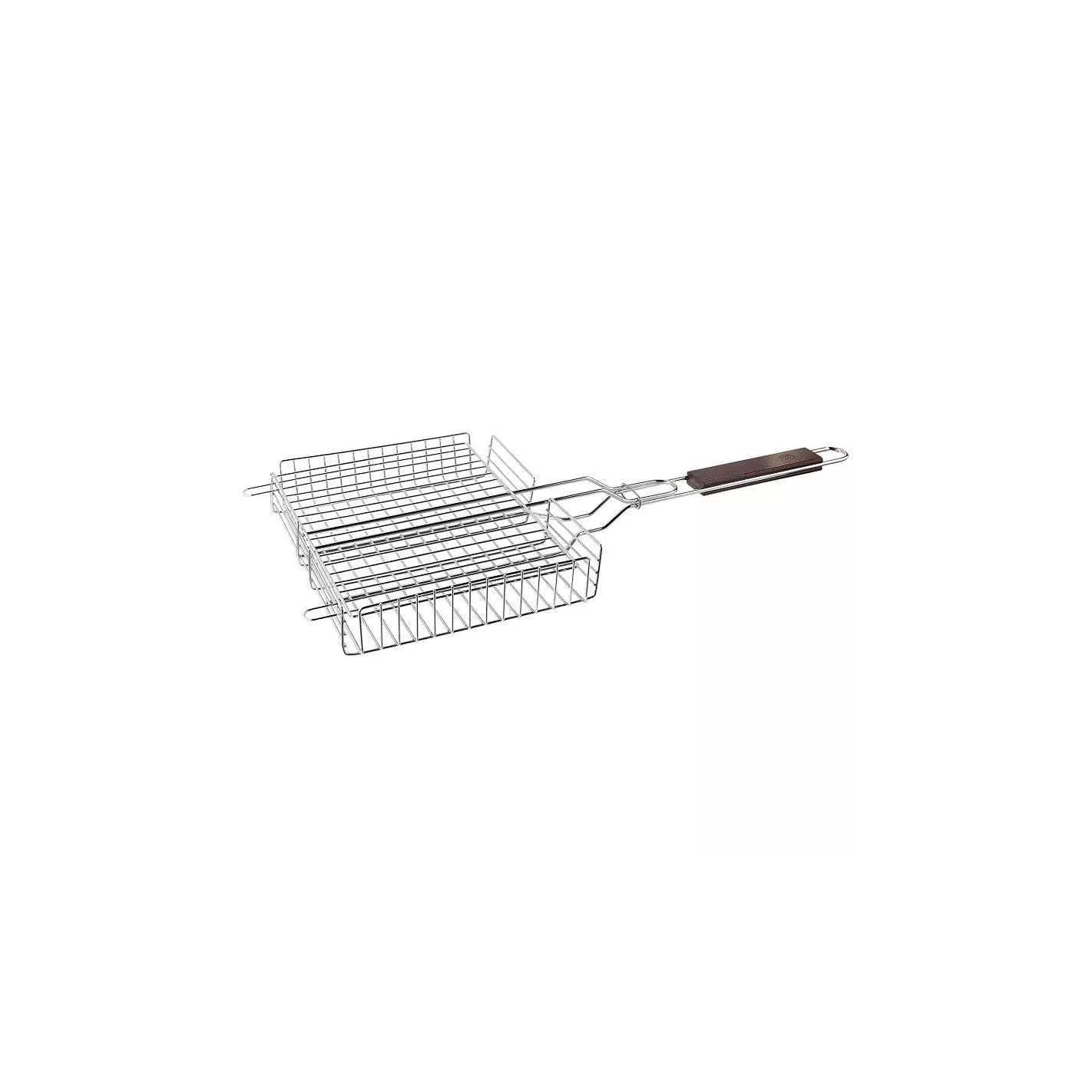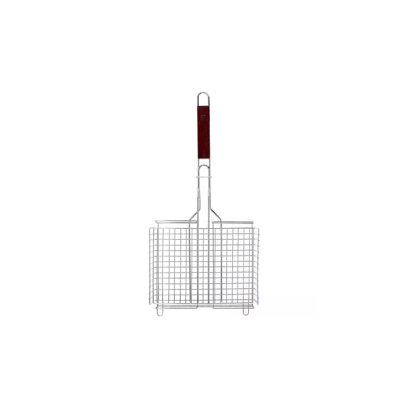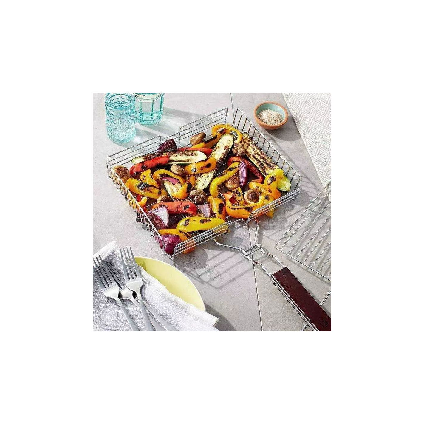 La canasta se voltea fácilmente para lograr un dorado perfecto en todos los lados y la longitud larga mantiene sus manos alejadas de las altas temperaturas. Construida de acero cromado de grueso calibre, la canasta cuenta con un mango de palisandro sólido y fino, que conduce el calor lentamente para minimizar las quemaduras. Cuando no está utilizando esta herramienta de parrilla imprescindible, se bloquea para un almacenamiento seguro y fácil.