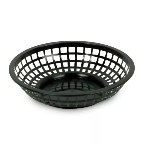 Cesta para la comida rápida, redonda, color negro, hecha de polipropileno, apilable. Diseño para la preparación de la mesa, se puede utilizar para fiestas de cumpleaños, bautizos, etc. Cómodo y eficiente para acomodar adornos y forma útil para conservar comida frita. Apta para lavavajillas, en la rejilla superior.