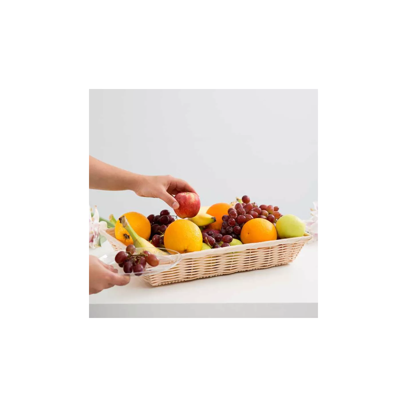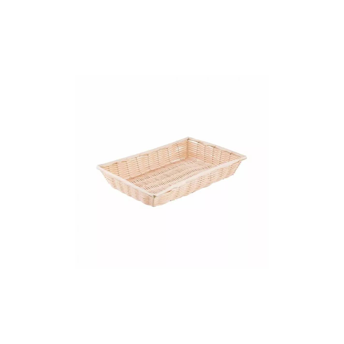 Presente una variedad de papas fritas o galletas saladas empaquetadas en su restaurante, pizzería o evento con catering en esta canasta rectangular de ratán. esta canasta de mimbre beige está hecha de polipropileno liso, lo que proporciona un exterior elegante y brillante con un borde trenzado elegante y sin bordes irregulares.