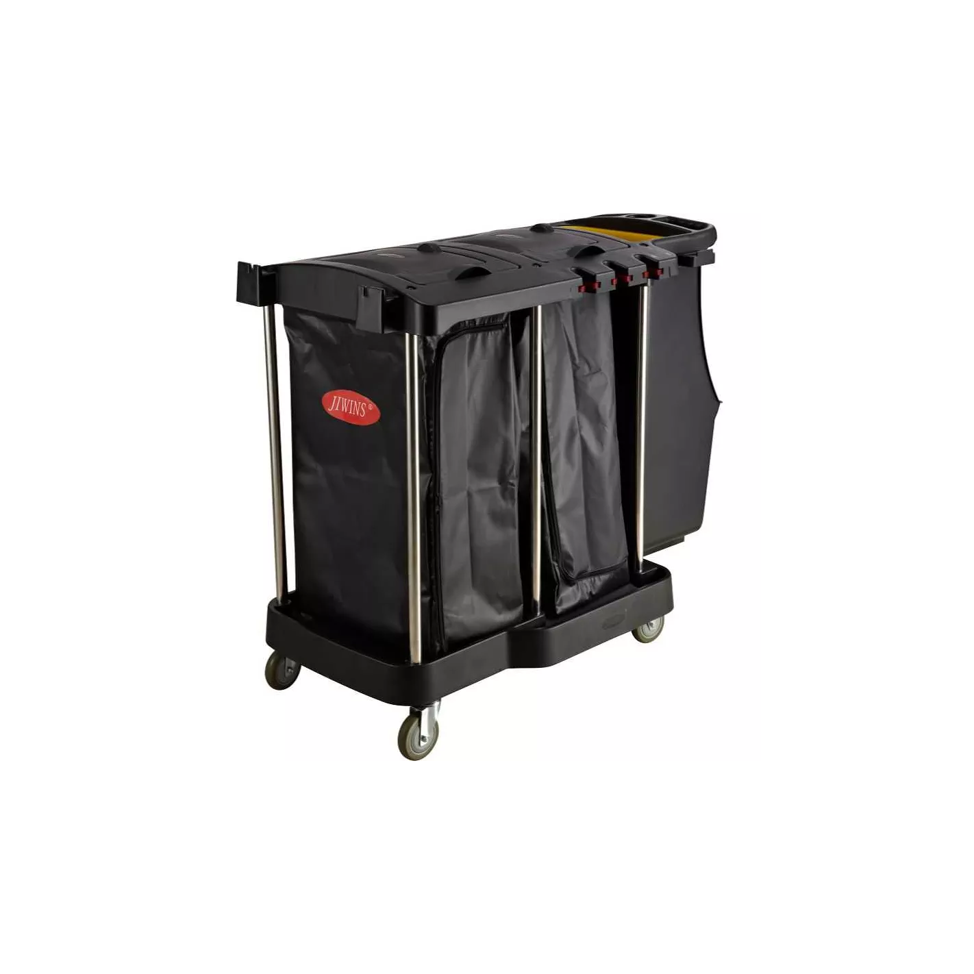 El carro de lavanderia o limpieza está diseñado con materiales que son de suma durabilidad ya sea para el hogar o trabajo comercial, su presentación viene en color negro y cuenta con soportes para colocar bolsas y rejillas especiales para escobas y palos de piso.