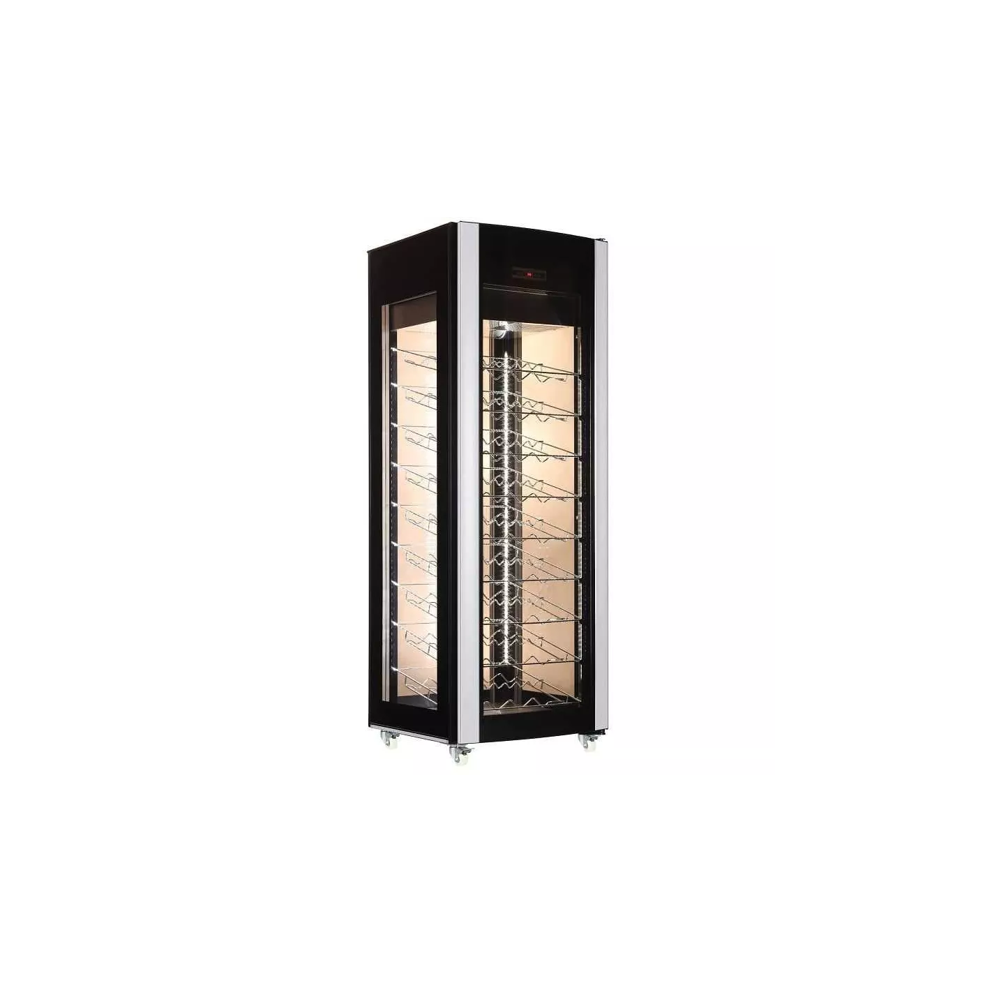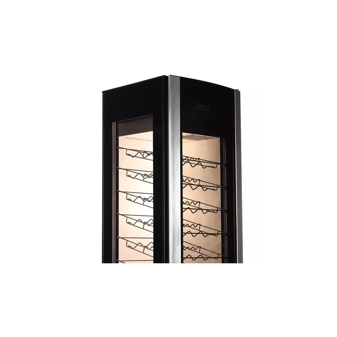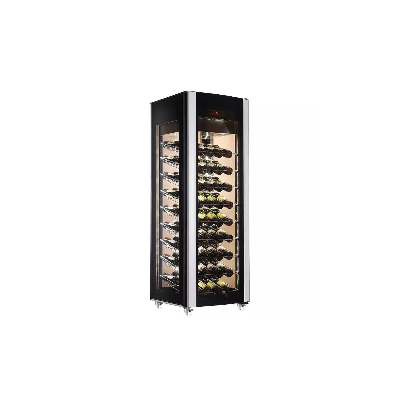 Este enfriador de vino de 81 botellas es perfecto para ubicaciones grandes o pequeñas. El nuevo diseño es moderno y elegante y se verá fantástico en cualquier habitación. Si eres un bebedor de vino ocasional o habitual, este será el complemento perfecto para tu colección. ¡Se ve genial y mantiene tus botellas favoritas a la temperatura adecuada, todo el tiempo !. Estructura externa e interna en acero, vidrio y plástico.