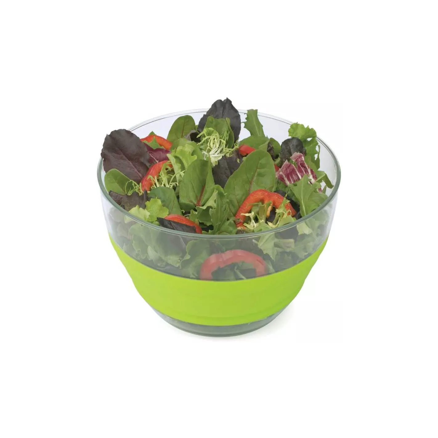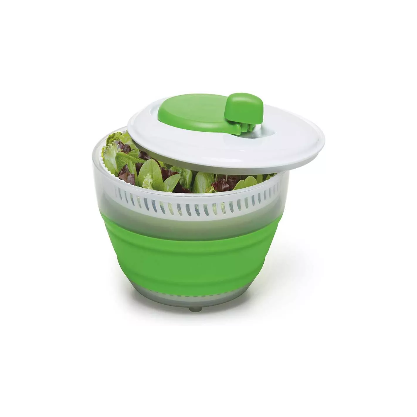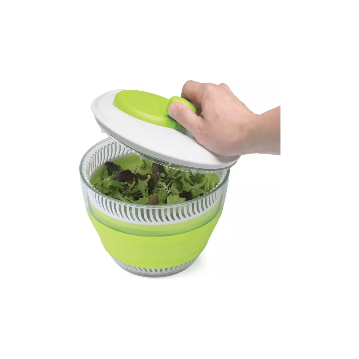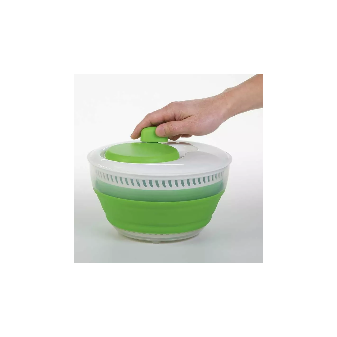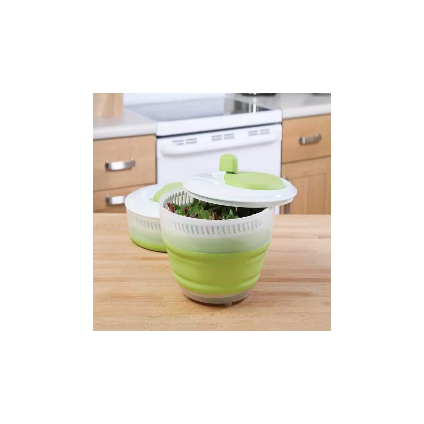Las centrífugas de ensalada son un elemento básico para la mayoría de las cocinas, pero a menudo son demasiado voluminosos para almacenar. Nuestro Spinner de ensalada plegable es una solución innovadora para este problema común. Este spinner único se contrae a la mitad de su tamaño para un almacenamiento compacto y se expande a tamaño completo para su uso. La canasta giratoria altamente eficiente también funciona como un colador.