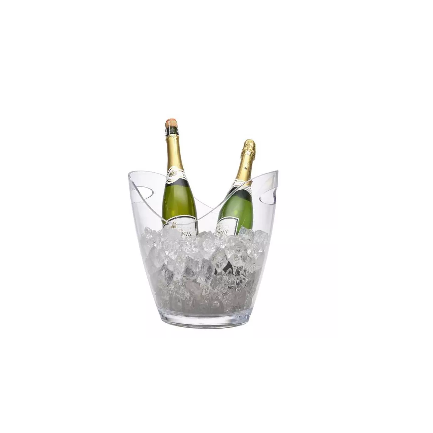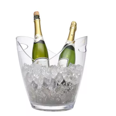 Ideal para presentar y enfriar vino y champán en hielo. Construcción de plástico. Diseñado para servicio de mesa de una sola botella o hasta 3 botellas. Completo con 2 asas para un fácil manejo.