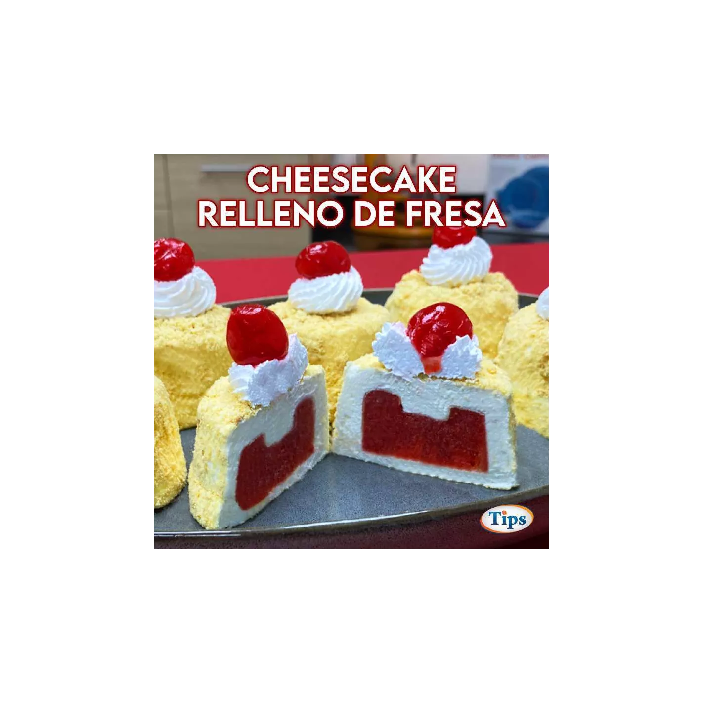 5.En el molde de silicón coloque una base de la crema de cheesecake en el centro el relleno de fresas y cubrir con la crema, refrigerar por 3 horas, desmoldar y pasar por galleta molida antes de servir.