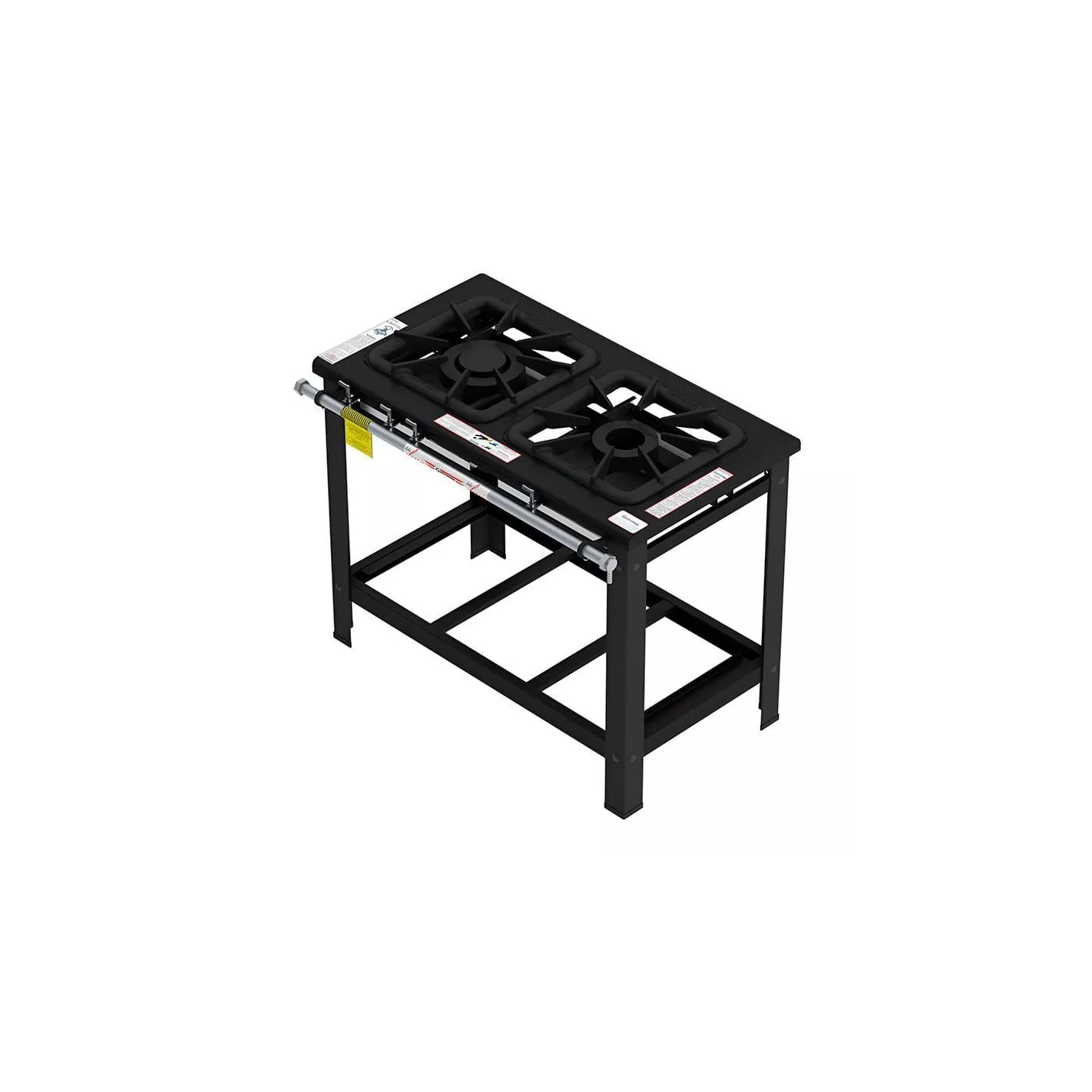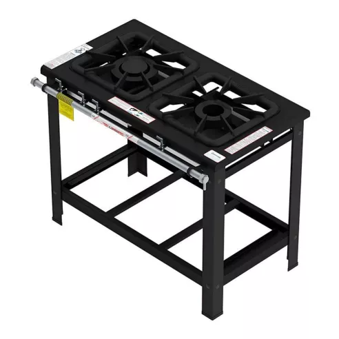 Cocina con dos quemadores dobles a gas, la cocina viene con una mesa con perfil estampado de 100 milímetros y sin costuras. Su estructura de acero al carbono. Viene con tubería de aluminio cepillado, los registros de latón cromado. Los quemadores de hierro fundido: simple doble llama de 150 milímetro de diámetro y doble de 200 milímetro de diámetro en cada quemador. Parrilla de hierro fundido 40 x 40 centímetros para cada quemador.