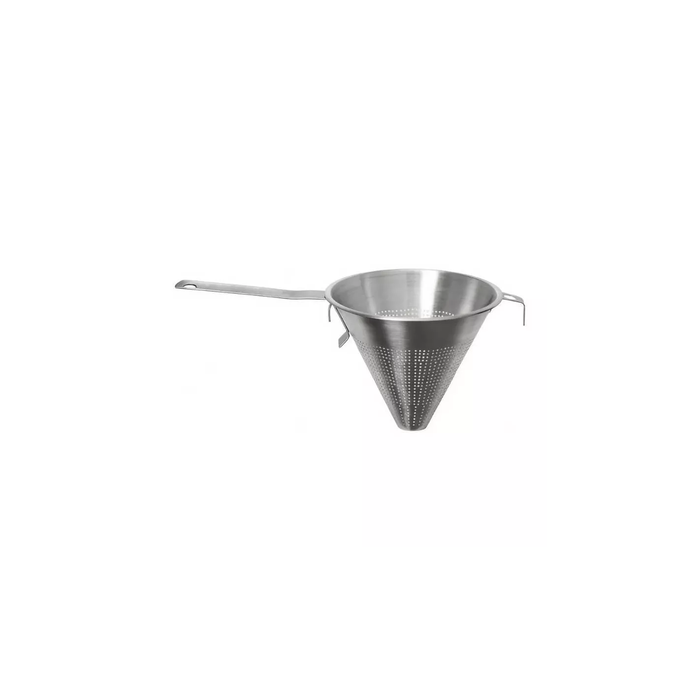 Colador cónico fabricado de acero inoxidable, este colador separa las partes sólidas del líquido y sin dejar pasar los grumos gracias a sus agujeros finos. Ofrece una excelente resistencia a la corrosión y a los ácidos alimentarios y sales, es un material liso, no poroso y muy higiénico, fácil de limpiar, y no transmite sabores extraños a los alimentos.