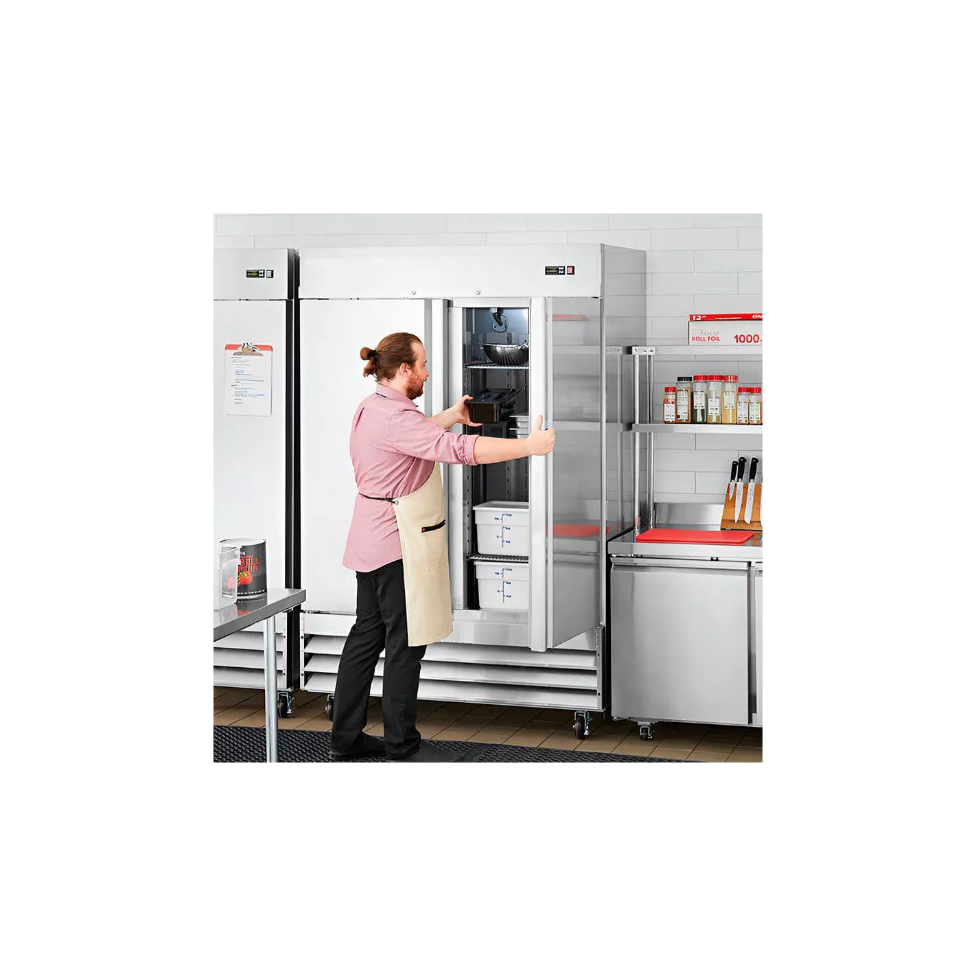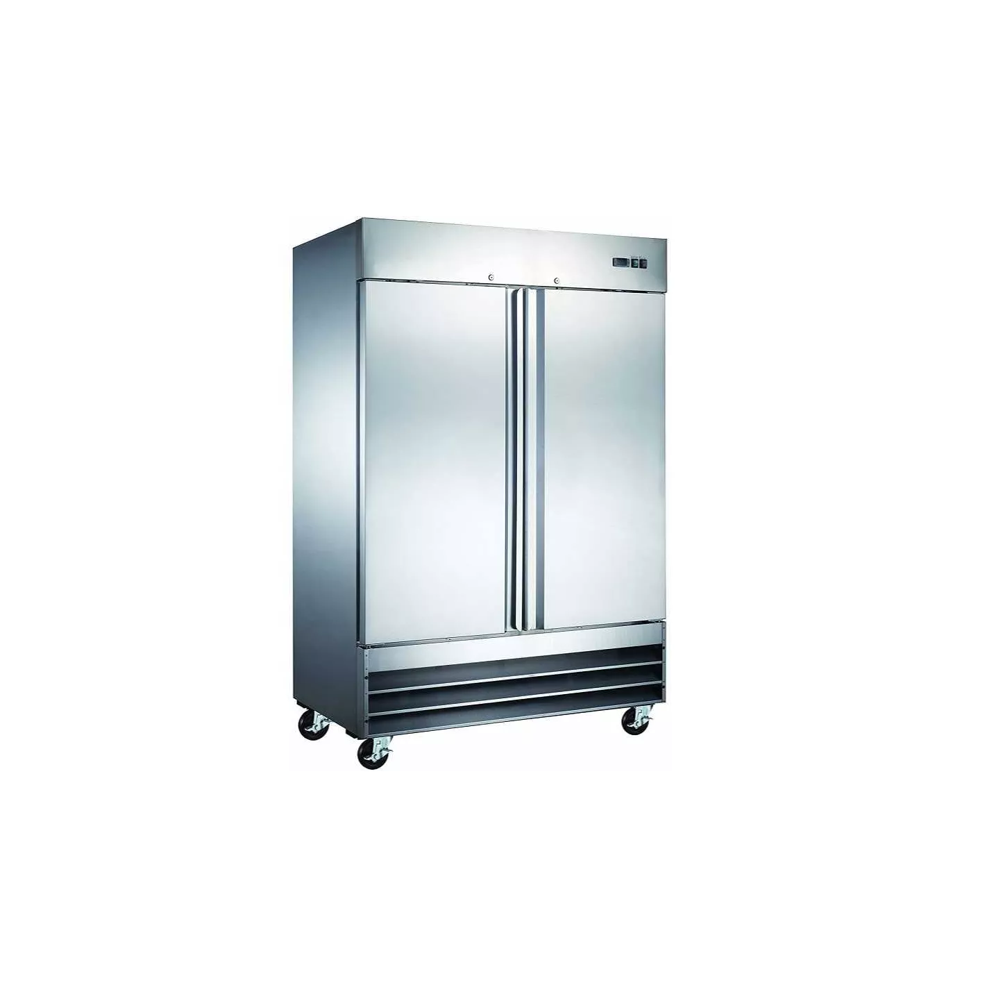 Congelador comercial de alta calidad de 2 puertas con capacidad de 48 pies cúbicos, es un equipo imprescindible para cualquier restaurante o cocina comercial. Es de alta resistencia tanto por dentro como por fuera. En combinación con el respaldo de aluminio, es lo suficientemente fuerte y duradero como para sobrevivir en cualquier entorno de cocina comercial. La unidad de enfriamiento está colocada en la parte inferior y se desliza hacia afuera para facilitar el mantenimiento y la limpieza. Todos los modelos vienen con ruedas de 6 pulgadas y estantes de alambre recubiertos de plástico que se pueden quitar fácilmente para ajustar la altura del estante.