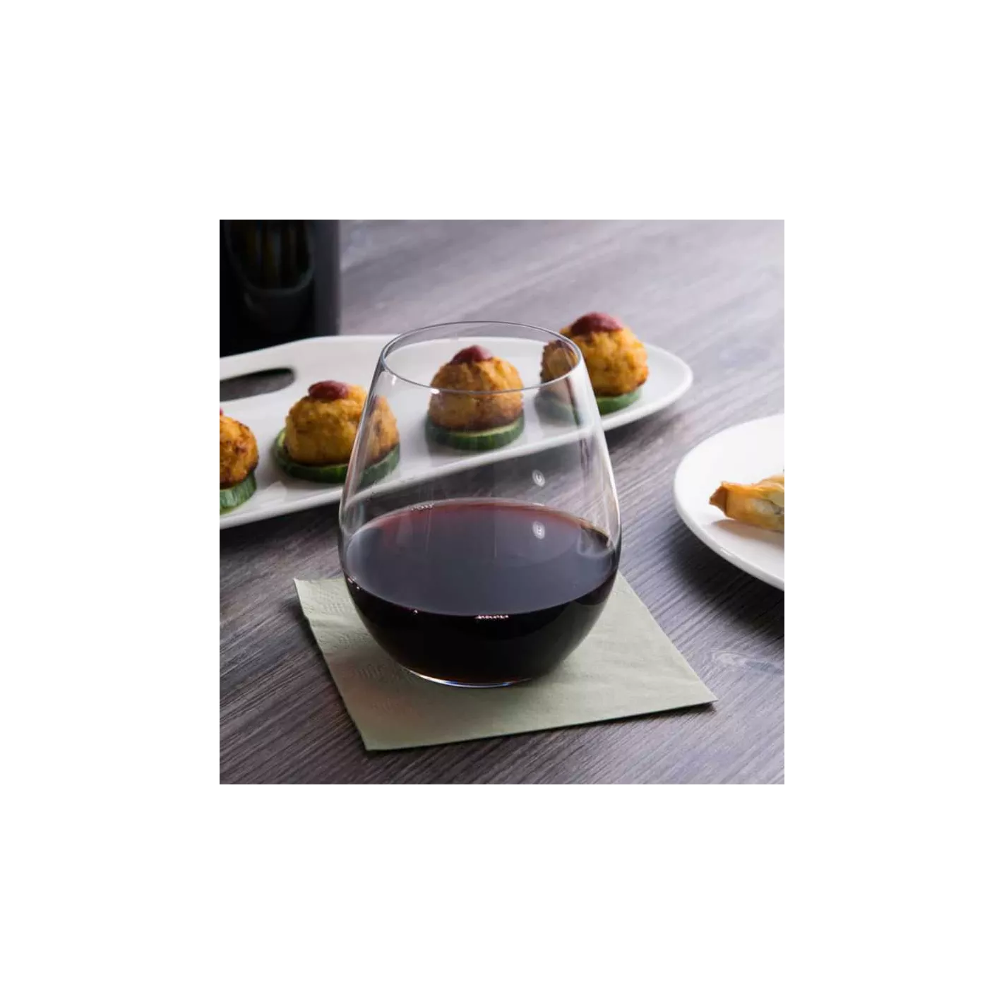 La copa de vino sin tallo, proporciona claridad, brillo y durabilidad. El diseño sin vástago crea una sensación contemporánea con un riesgo reducido de rotura. Vinos, jugos y refrescos se pueden servir en este vaso con su diseño versátil. El borde fuerte tiene un borde fino y sin cuentas para proporcionar una pantalla elegante, mientras que la parte superior cónica mejora los aromas y sabores.