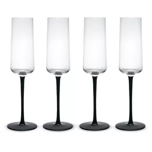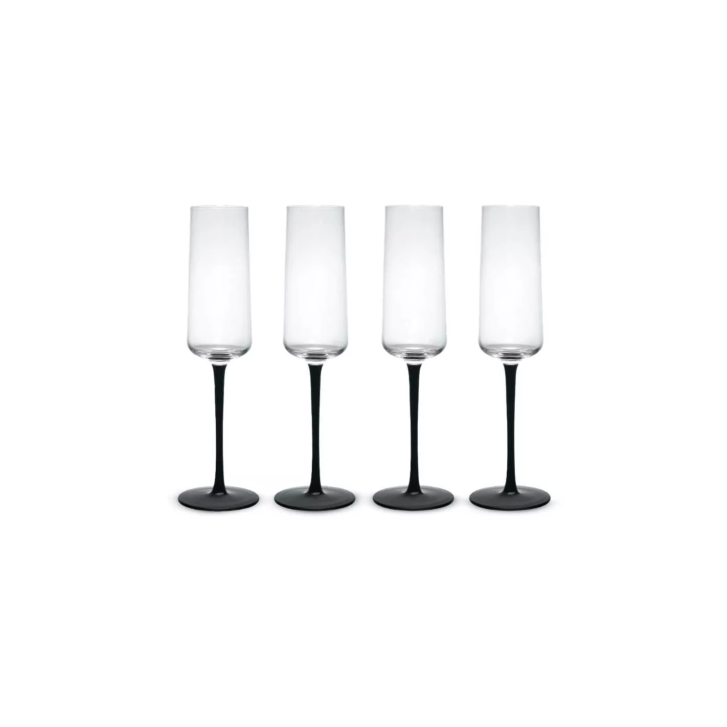Estas copas de champán hechas de cristal puro sin plomo, se destacan por su diseño contemporáneo y su claridad superior. Estas copas, colocadas sobre un tallo y una base negros mate en contraste, cuentan con un cuerpo estrecho para prolongar la efervescencia y un tallo largo para mantener la copa fría al sostenerlas.