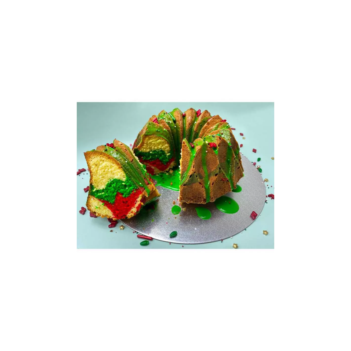 Coloque en el molde de chimenea engrasado enharinado una capa de pasta neutra, otra verde y por último la roja hornear por 35 a 40 minutos o al introducir un palito sale limpio.