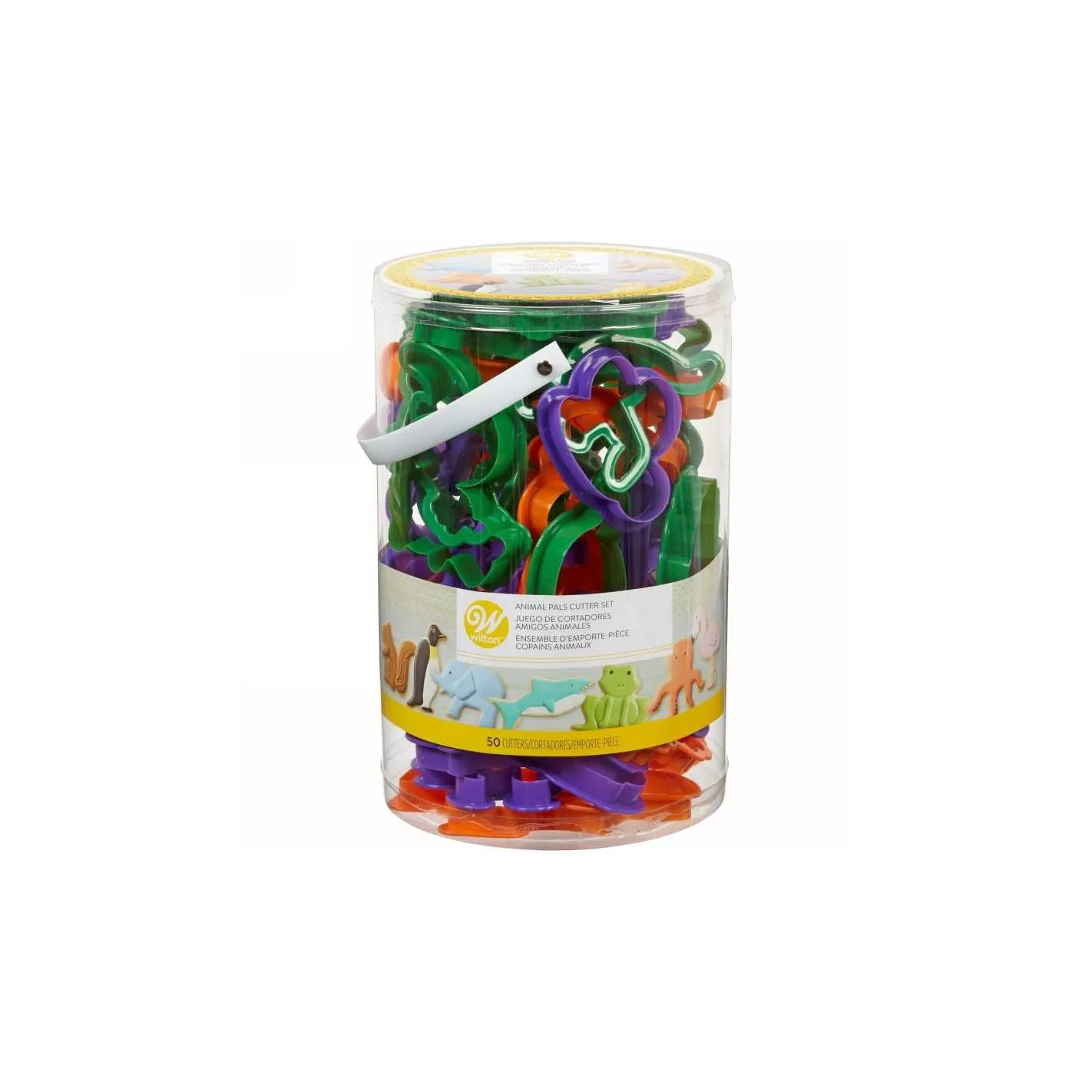 Cortador de galletas Wilton con una colección de formas animales favoritas. ¡Incluye formas de gatos, pájaros y mariposas, reptiles y más! El contenedor de plástico no es necesario para el uso de este producto, el contenedor solo contiene los cortadores.