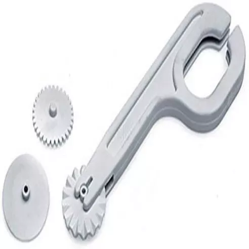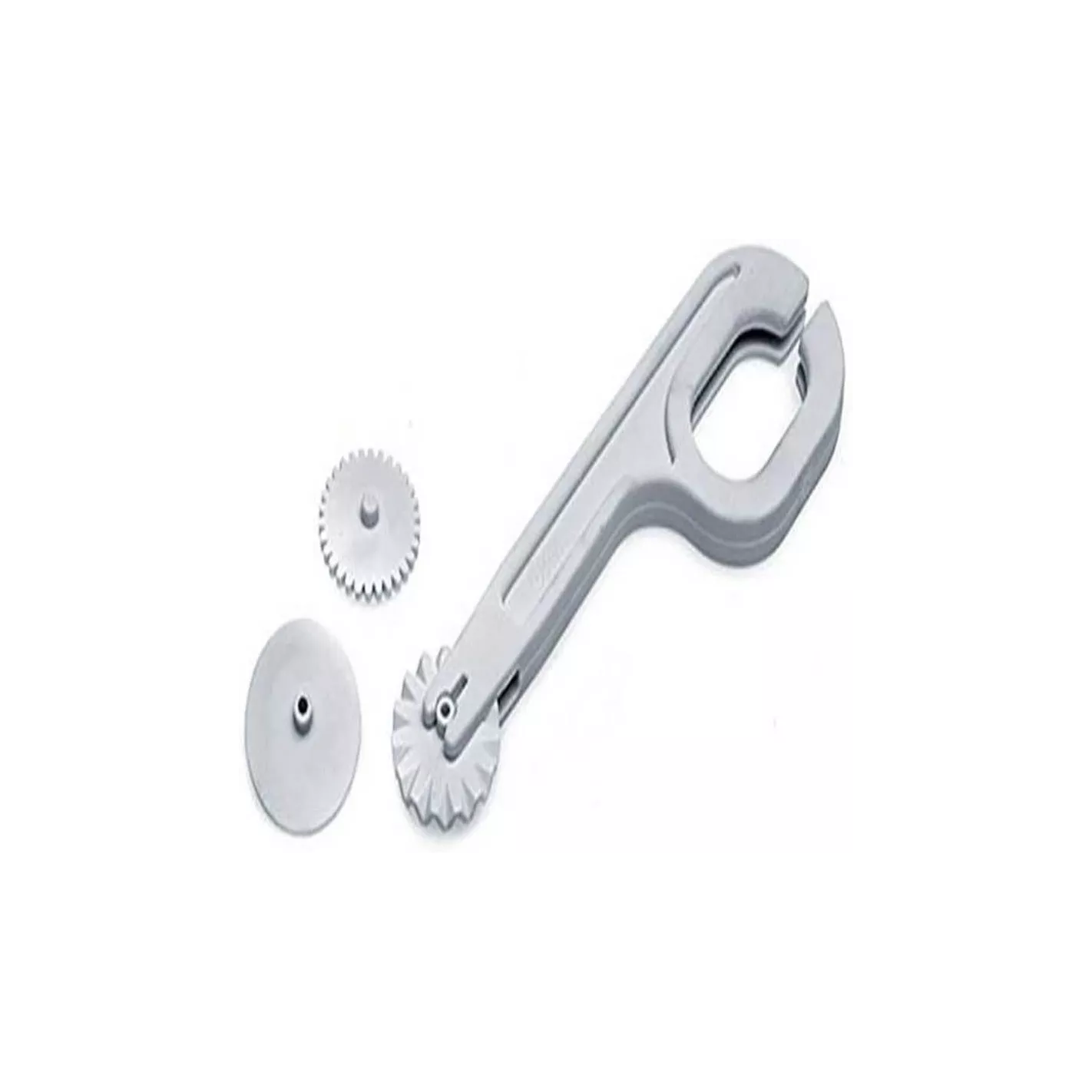 Tres ruedas desmontables para cortar y estampar patrones en fondant con esta herramienta de corte / estampado. Diseño ligero y fácil de rodar corta en el ángulo perfecto.