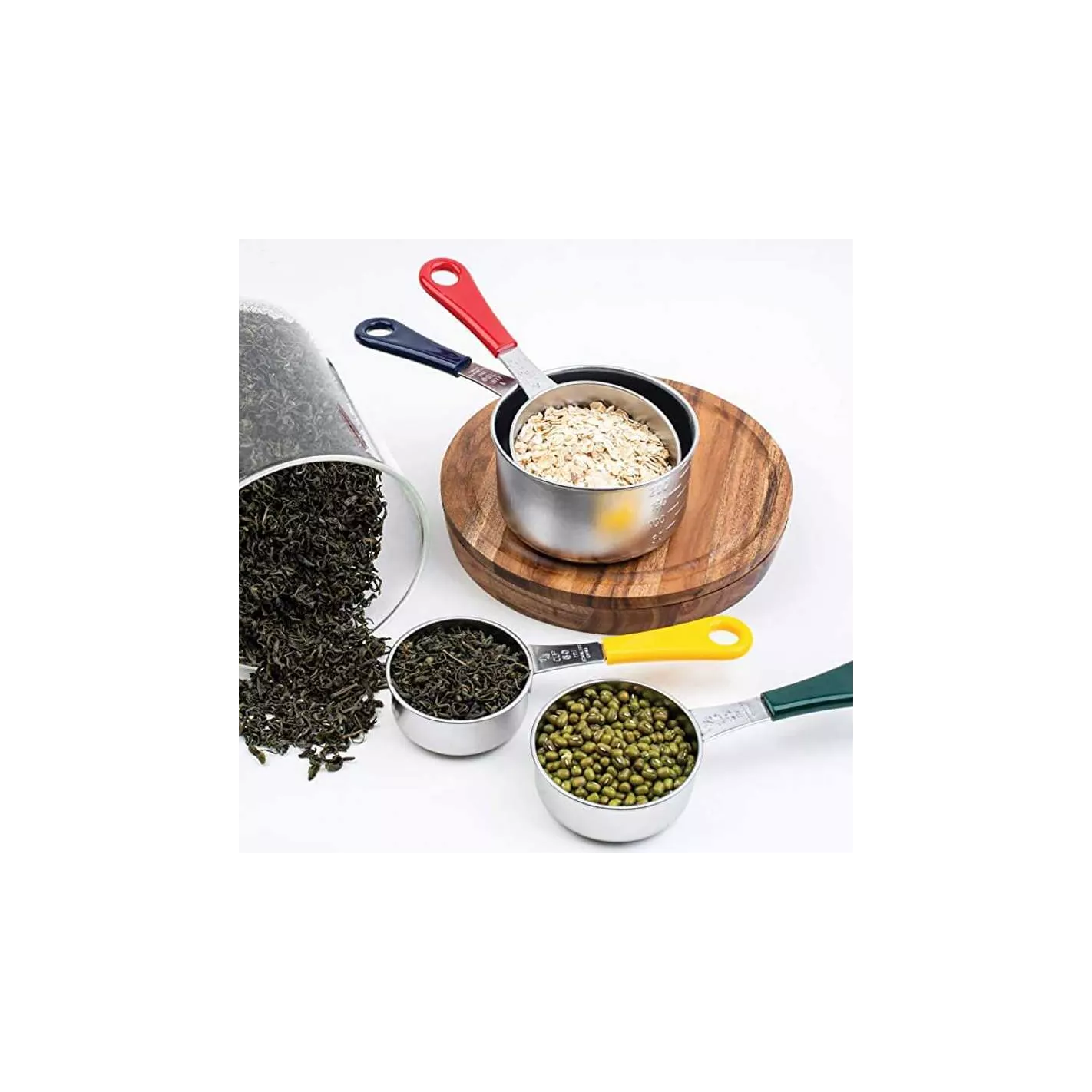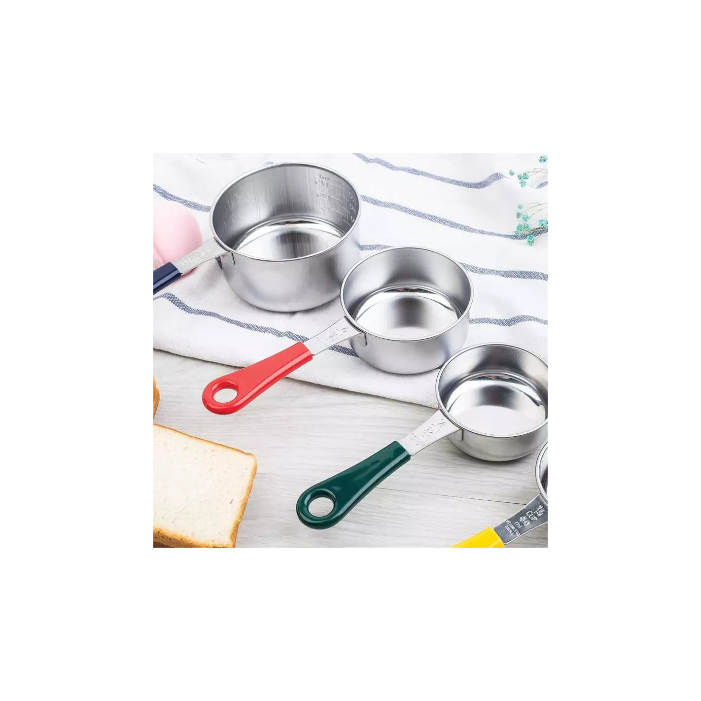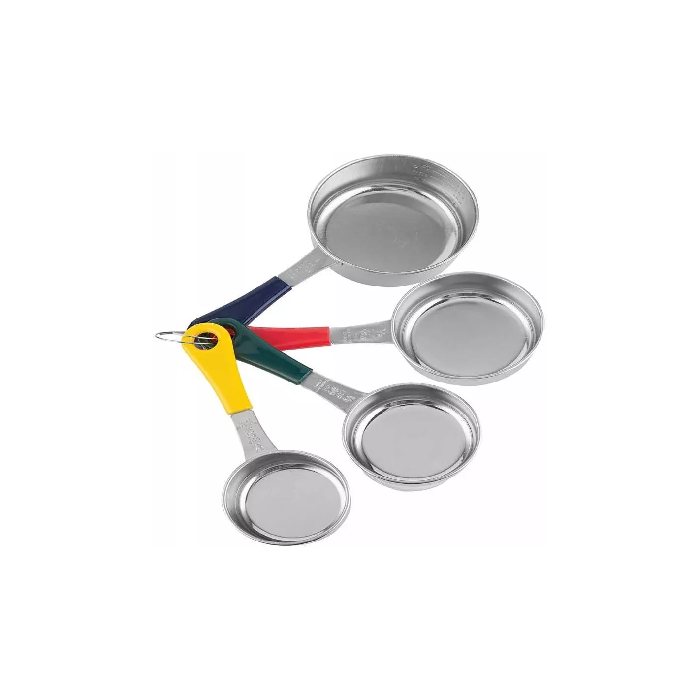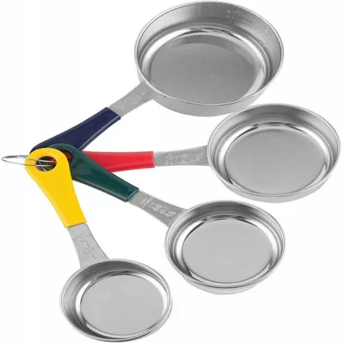 Ya sea que esté cocinando u horneando, las medidas precisas son clave para un excelente producto terminado. Nuestro juego de tazas medidoras de acero inoxidable es una parte esencial del proceso de preparación. El juego de 4 piezas cuenta con mangos de plástico recubiertos de colores para un fácil reconocimiento en los cajones de su cocina y un agarre cómodo. Las medidas incluidas son 1/4 taza, 1/3 taza, 1/2 taza y 1 taza, que pueden anidarse una dentro de la otra para un fácil almacenamiento. Lo mejor de todo es que las medidas están grabadas en el metal, por lo que no se lavarán. Asegúrese de tener este vaso medidor cerca para ayudarlo a crear y hornear pasteles, cupcakes, brownies, galletas y más perfectos.