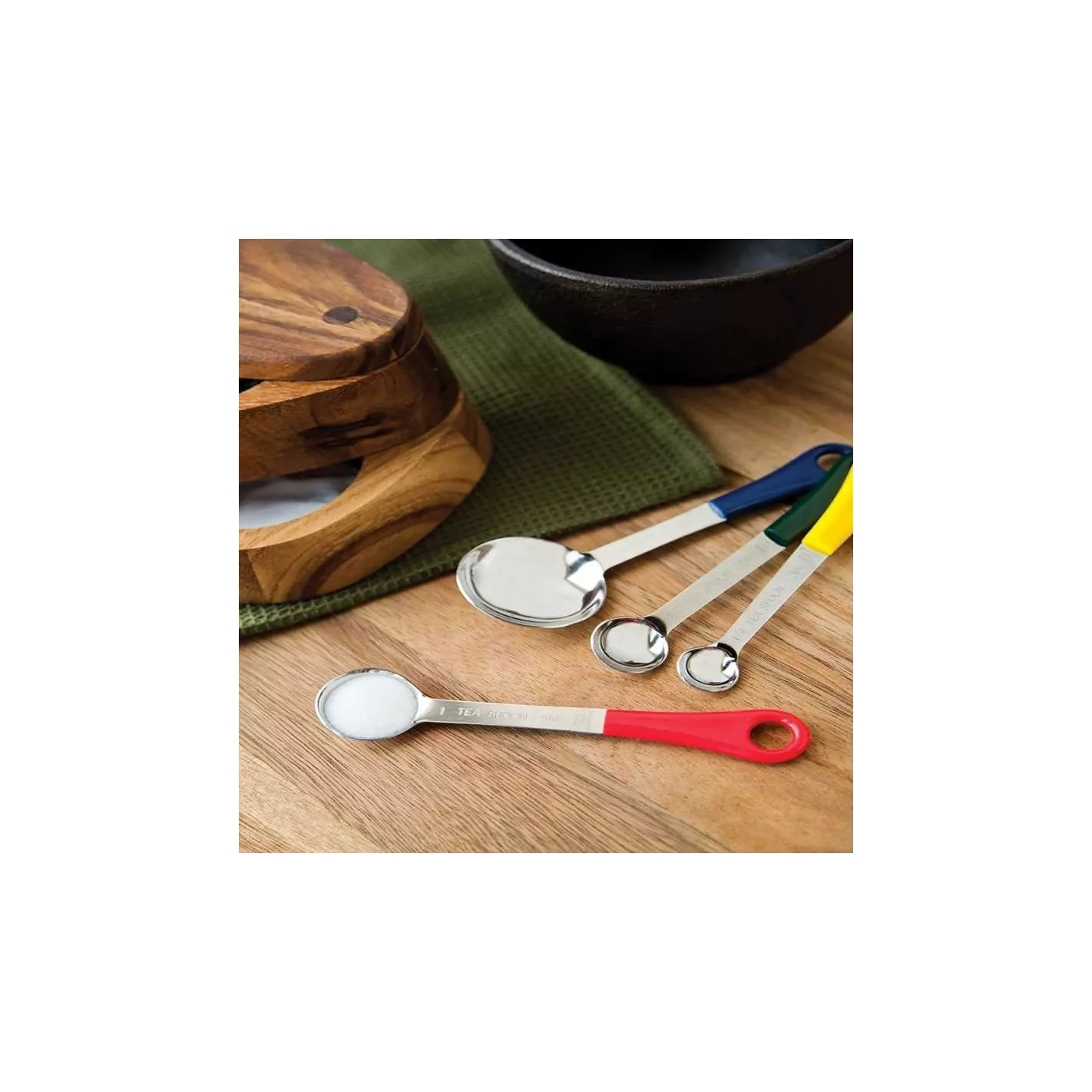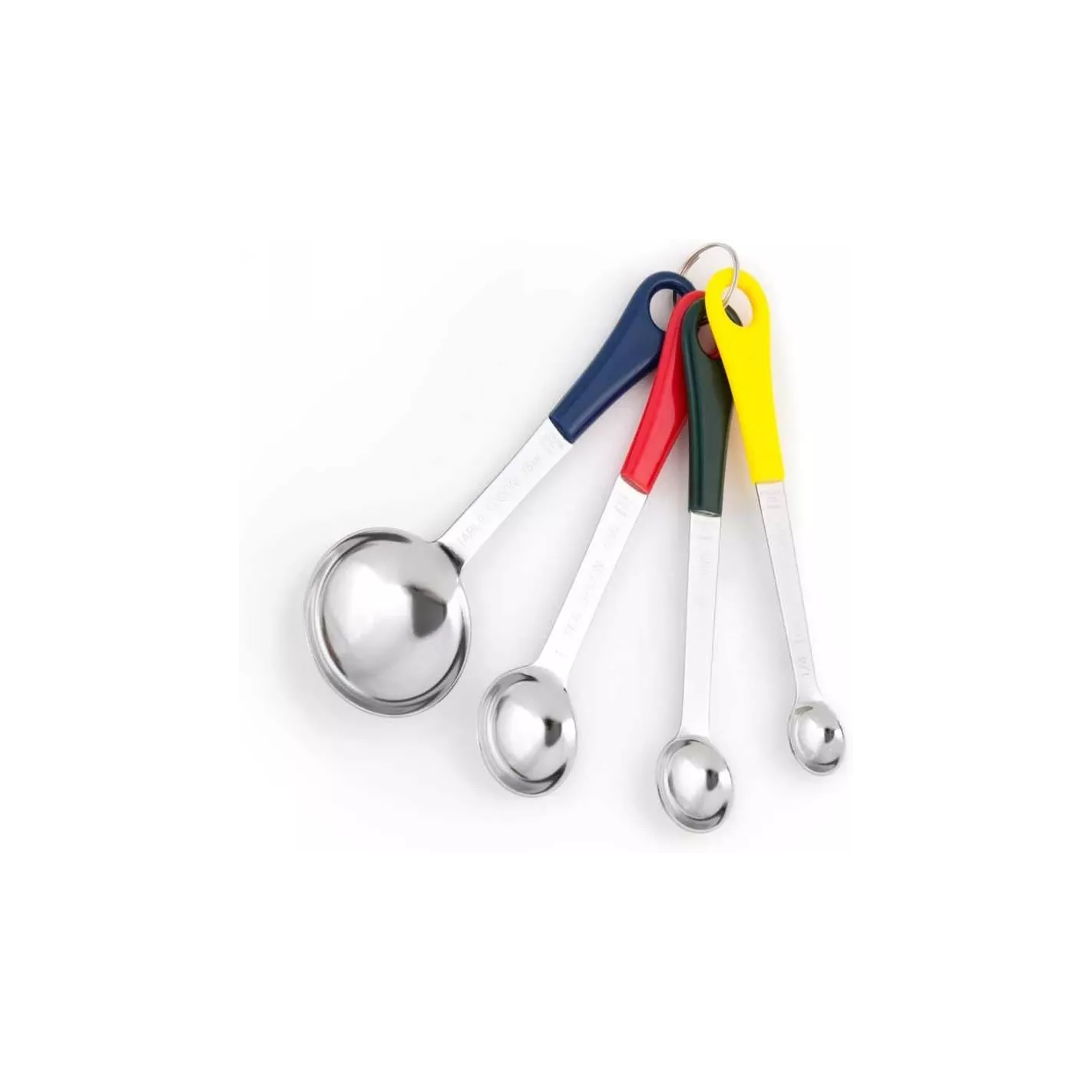 Ya sea que esté cocinando u horneando, las medidas precisas son clave para un excelente producto terminado. Nuestro juego de cucharitas medidoras de acero inoxidable es una parte esencial del proceso de preparación. El juego de 4 piezas cuenta con mangos de plástico recubiertos de colores para un fácil reconocimiento en los cajones de su cocina y un agarre cómodo. Las medidas incluidas son 1/4 cucharadita, 1/2 cucharadita, 1 cucharadita y 1 cucharada. Lo mejor de todo es que las medidas están grabadas en el metal, por lo que no se lavarán. Asegúrese de tener estas cucharas medidoras cerca para ayudarlo a crear y hornear pasteles, cupcakes, brownies, galletas y más perfectos.