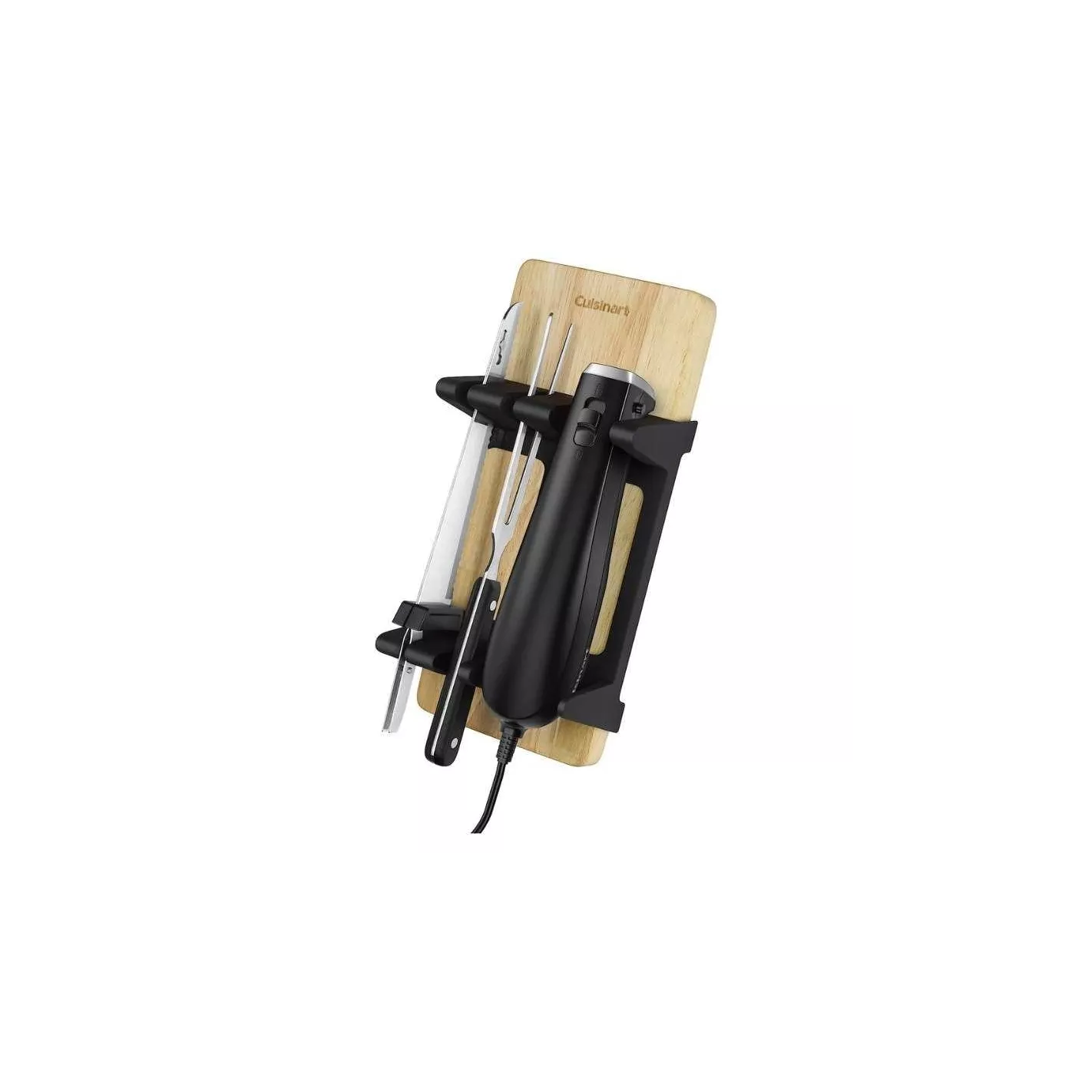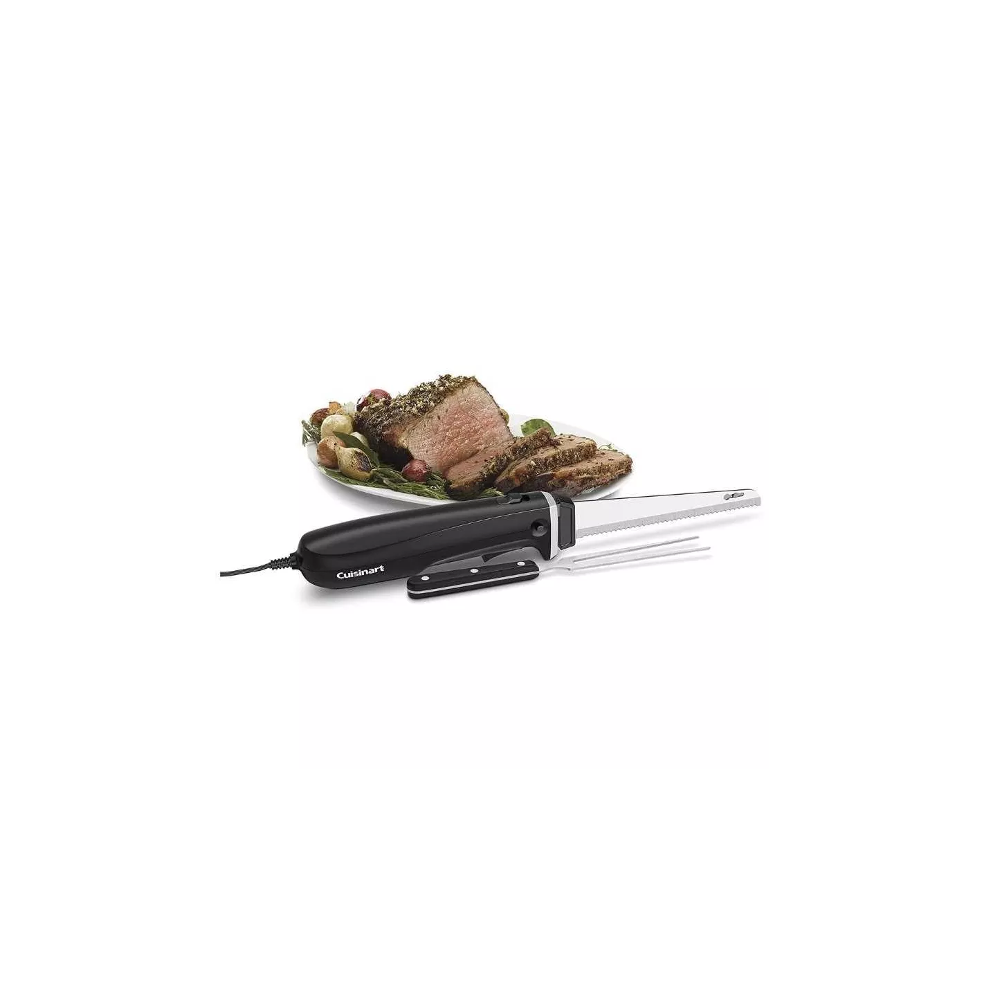 El cuchillo eléctrico incluye un tenedor para tallar y servir, el mango eléctrico, la cuchilla y la horquilla tienen su propia bandeja cuando no esté en uso. La cuchilla ultra afilada del cuchillo eléctrico Cuisinart corta carnes y pollos tan rápida y suavemente como cortar el pan. El mango ergonómico es cómodo, incluso con un uso prolongado, lo que permite a los usuarios cortar rebanadas consistentemente uniformes, una tras otra. Un simple interruptor de encendido y apagado al instante en que se suelta el gatillo
