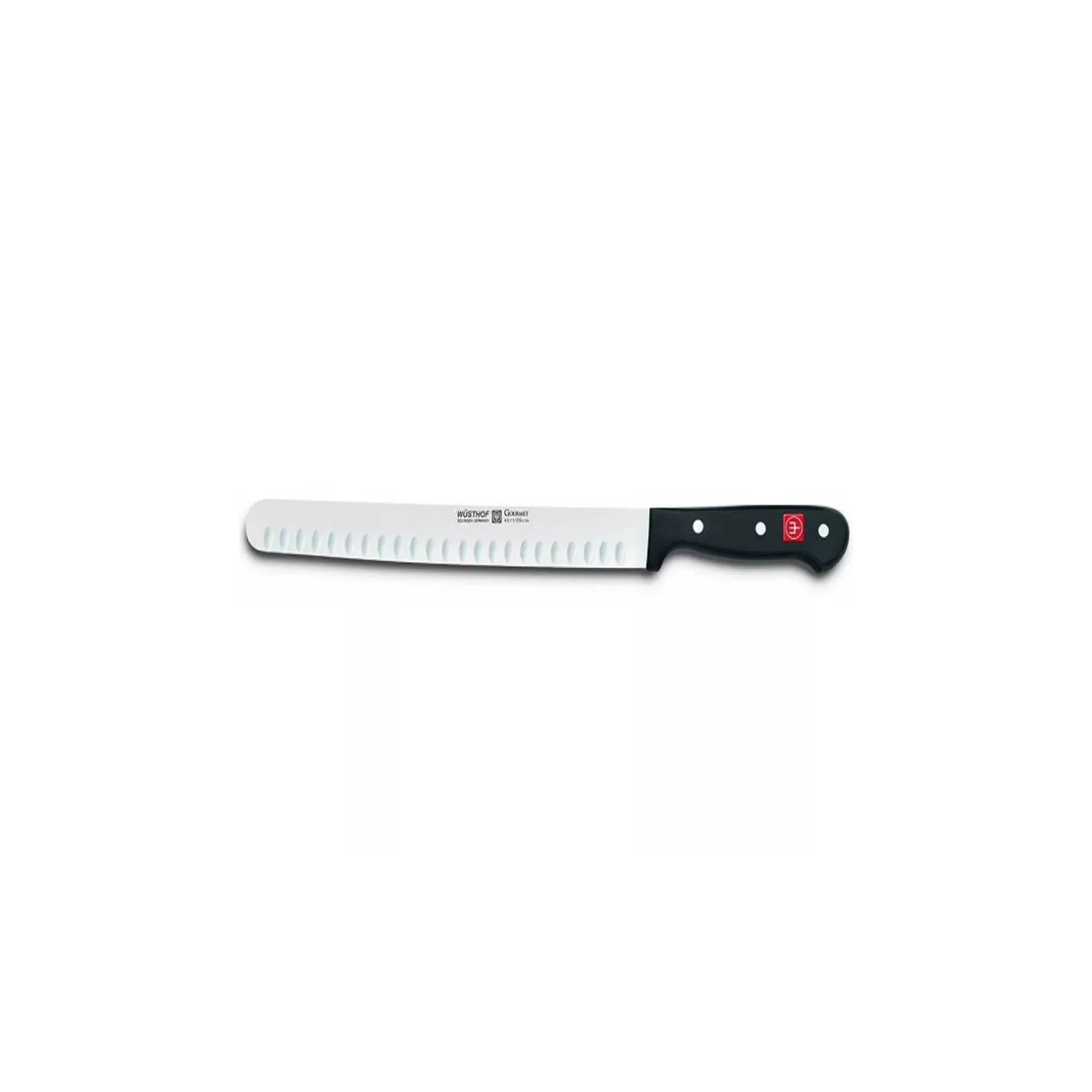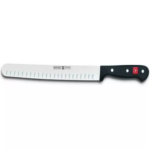El cortador de jamón se ha ganado su nombre: su forma y su filo están pensados ??para cortar lonchas muy finas de ingredientes duros, especialmente jamones. Estas cualidades hacen que este cuchillo sea ideal para cortar frutas y verduras y otras carnes, así como para cortar asados.