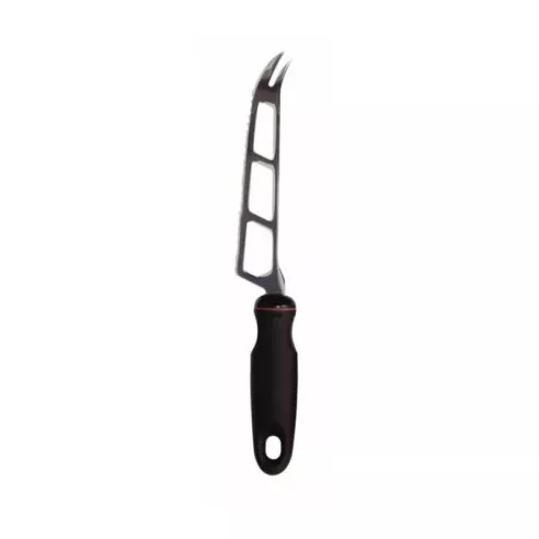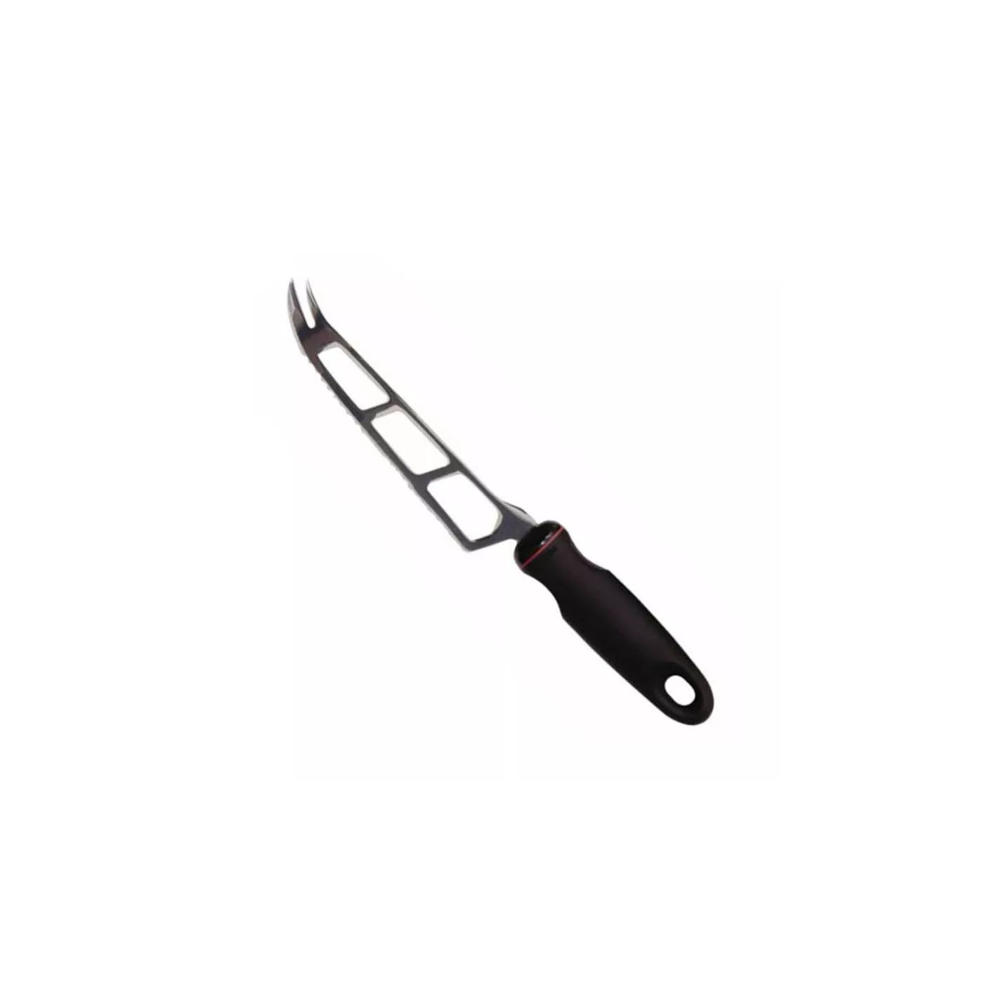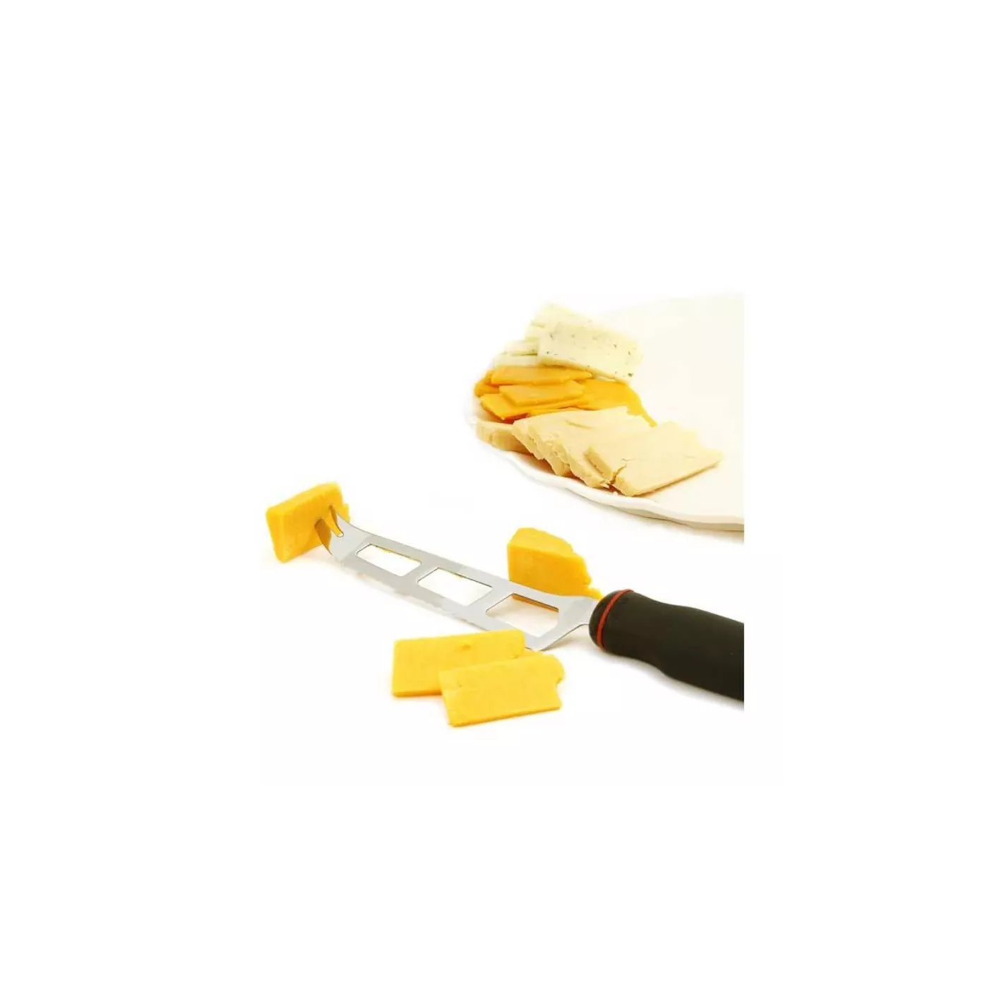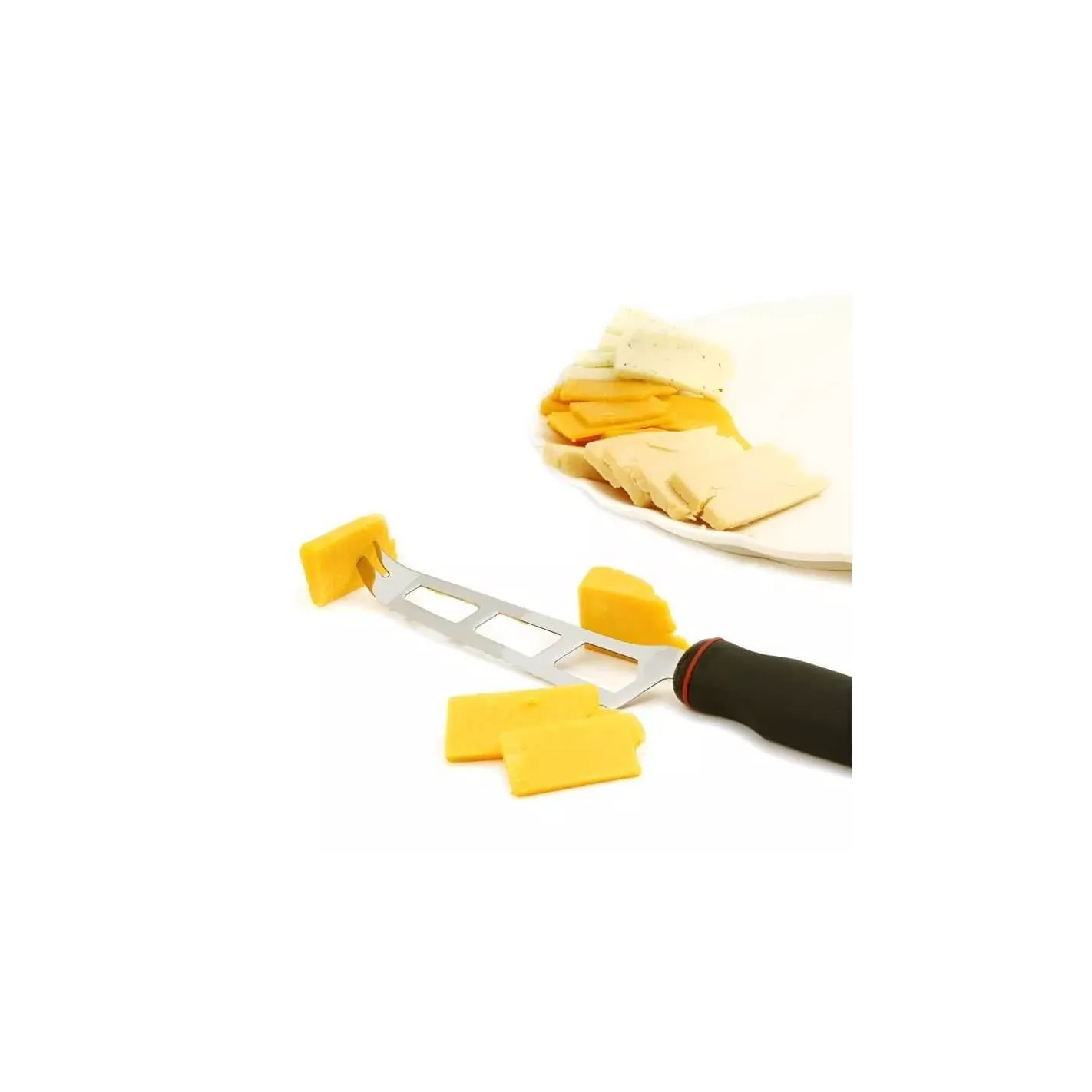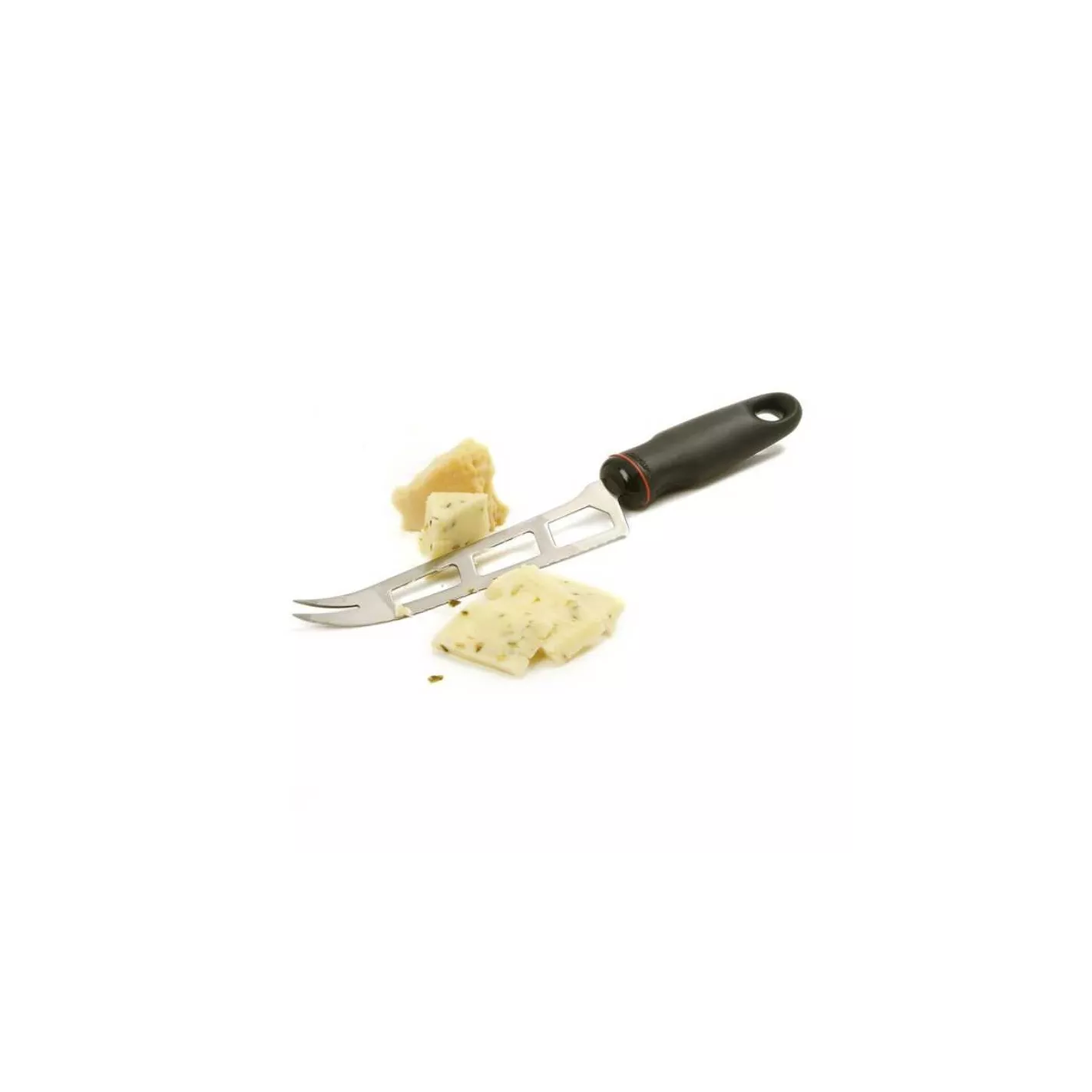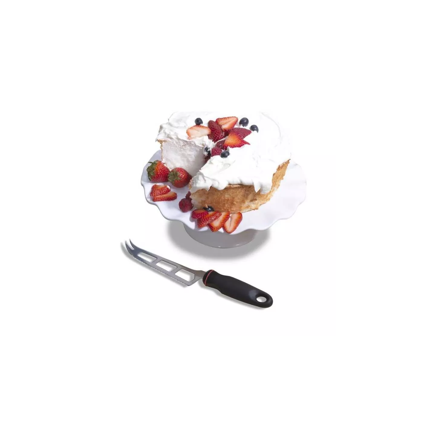 El mango tiene una forma patentada, diseñada ergonómicamente para adaptarse perfectamente al uso con la mano derecha o izquierda. El mango de gran tamaño y las hendiduras para los dedos brindan un excelente agarre sin esfuerzo y mantienen las manos alejadas de la superficie funcional de la herramienta. La hoja dentada y las secciones recortadas permiten que el cuchillo se deslice con gracia a través del pastel de ángel. Funciona para quesos de pulgadas pegajosas como Chevre y Brie.