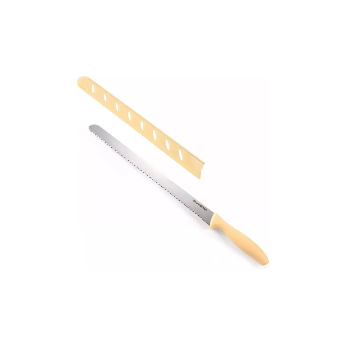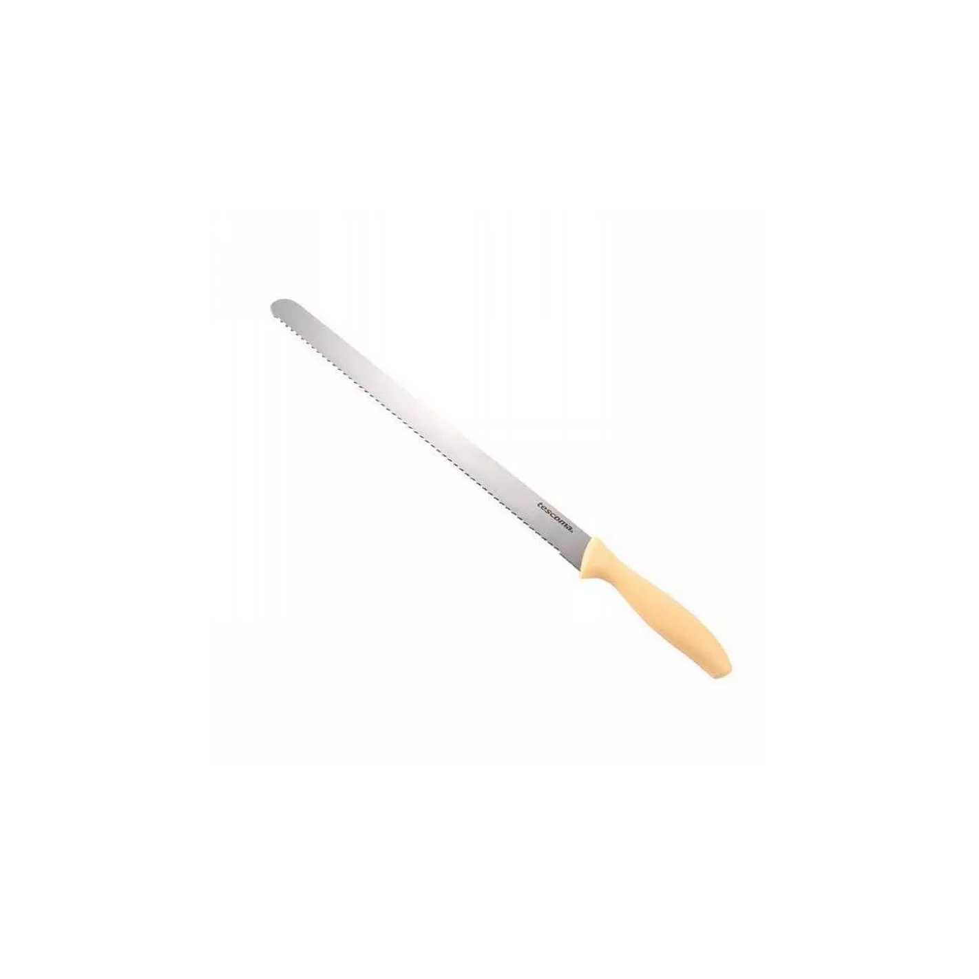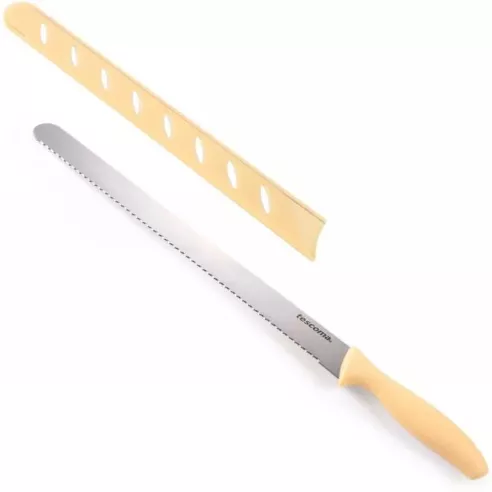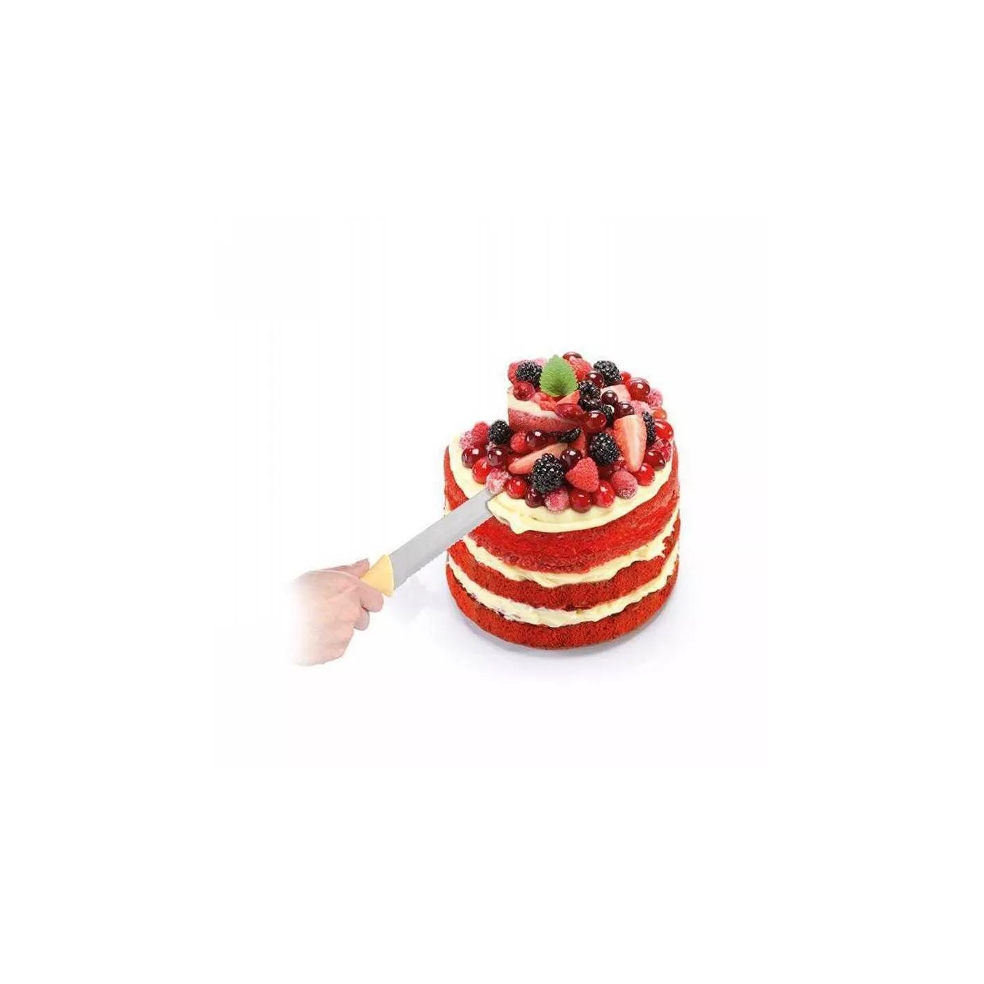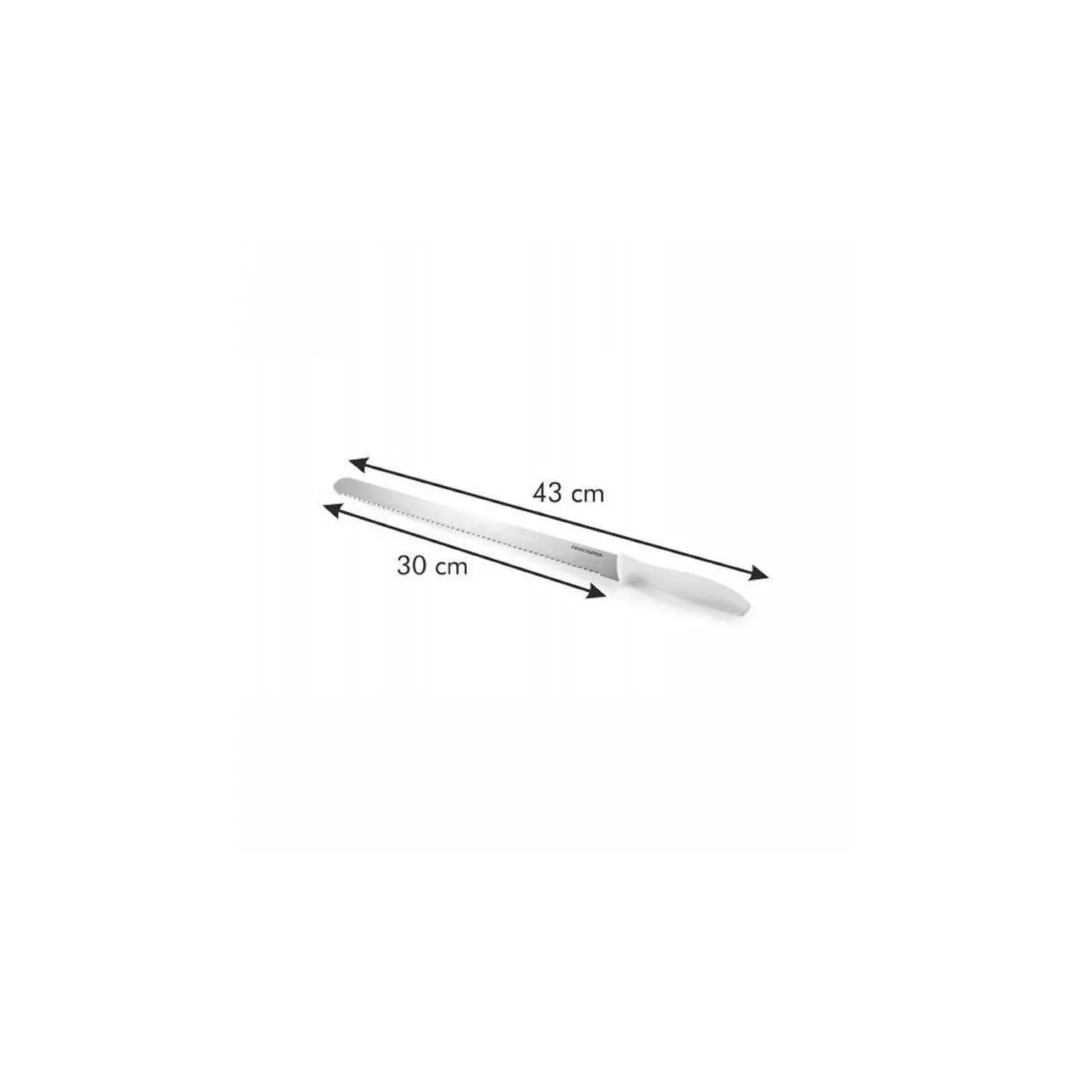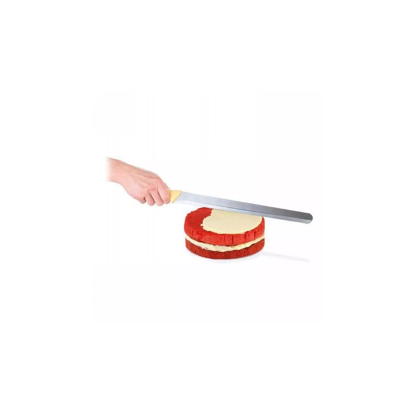 Cuchillo con hoja extra larga y delgada y filo de forma especial, excelente para dividir fácilmente las bases de los pasteles en capas, dividir pasteles y untar uniformemente el glaseado. Hecho de acero inoxidable de alta calidad y plástico resistente. Almacenar con el protector protector puesto. Las medidas del cuchillo son: hoja de 30 centímetros, mango de 13 centímetros, la medida total del cuchillo tomando en cuenta su mango es de 43 centímetros
