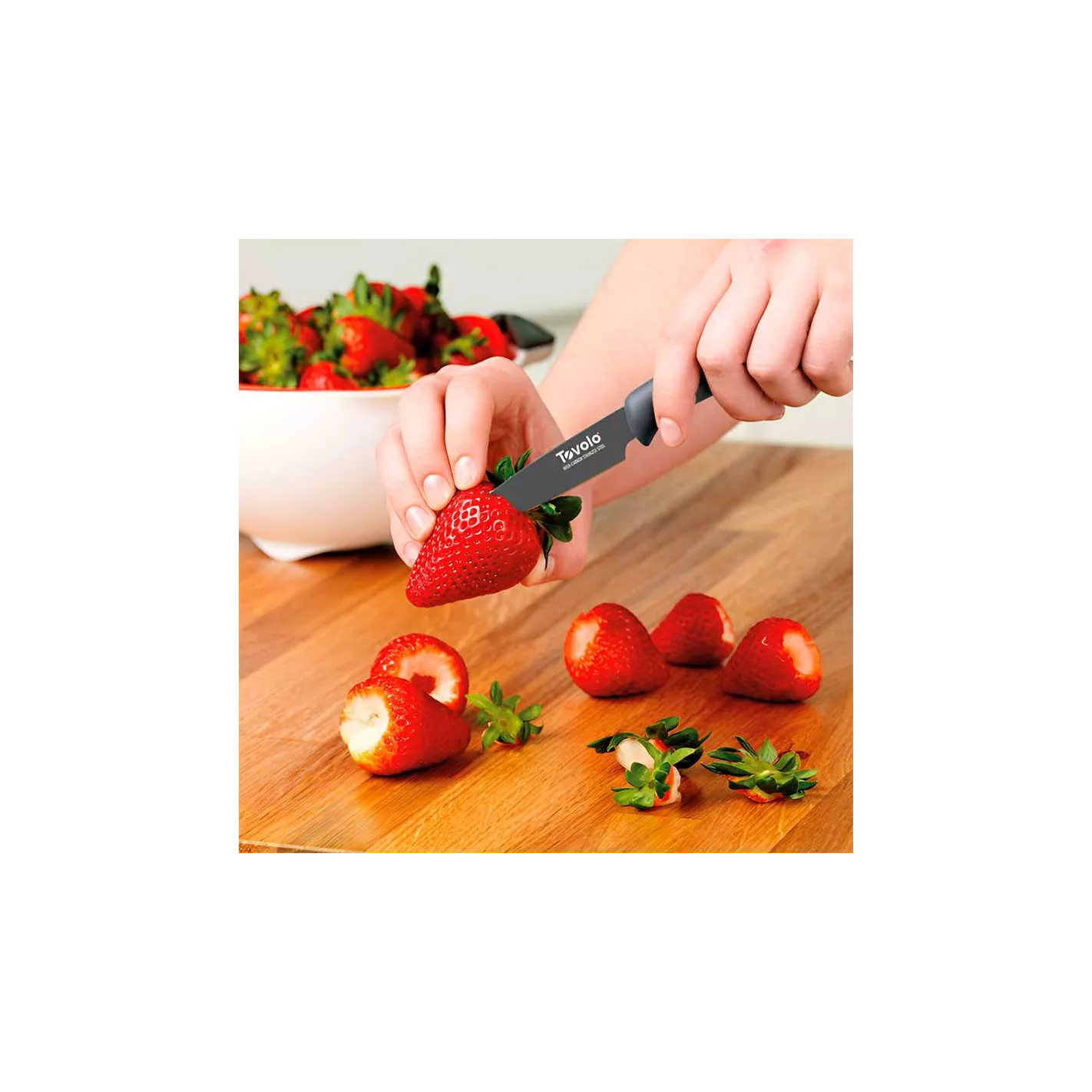 Perfecto para pelar y cortar en cubitos frutas y verduras, el cuchillo para pelar de Tovolo es un utensilio de cocina que no debe dejar pasar. El acero inoxidable con alto contenido de carbono súper afilado es duradero y dura años. El cuchillo para pelar tiene el tamaño perfecto para cortes precisos y detallados; la hoja afilada perfora incluso las pieles más duras de tomates, manzanas y otras frutas y verduras.