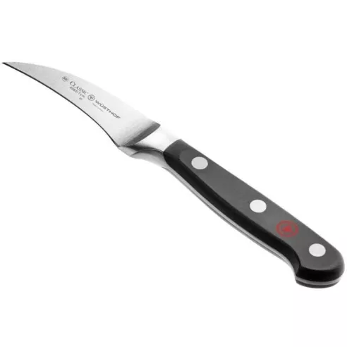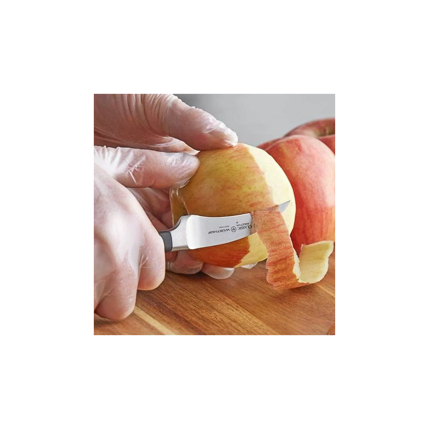 Este cuchillo pelador tiene una hoja curva que es ideal para pelar, limpiar o dar forma a cualquier fruta o verdura redondeada. También es ideal para creando guarniciones decorativas como hongos estriados.